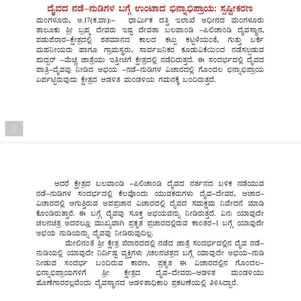 ದೈವಸ್ಥಾನದ ಆಡಳಿತ ಮಂಡಳಿಂದ ಸ್ಪಷ್ಟನೆ ಏನು? ಮಂಗಳೂರು ತಾಲೂಕಿನ ಬಜಪೆ ಸಮೀಪದ ಪಡುಪೆರಾರ ಕ್ಷೇತ್ರದಲ್ಲಿರುವ ಬ್ರಹ್ಮ ದೇವರು ಬಲವಾಂಡಿ-ಪಿಲ್ಚಂಡಿ ದೈವಸ್ಥಾನದ ಆಡಳಿತ ಮಂಡಳಿ ದೈವದ ನುಡಿ ಕುರಿತು ಸ್ಪಷ್ಟನೆ ನೀಡಿದೆ. ‘ದೈವವು ನೀಡಿದ ಅಭಯ ನಡೆ ನುಡಿಗಳ ವಿಚಾರದಲ್ಲಿ ಗೊಂದಲ ಭಿನ್ನಾಭಿಪ್ರಾಯ ನಿರ್ಮಾಣವಾಗಿದೆ. ಕೆಲವು ಯುವಕರು ದೈವದ ಅಪಚಾರದ ಬಗ್ಗೆ ದೈವದ ಬಳಿ ನಿವೇದನೆ ಮಾಡಿಕೊಂಡಿದ್ದಾರೆ. ಈ ಬಗ್ಗೆ ದೈವವು ಸೂಕ್ತ ಅಭಯ ನೀಡಿದೆ ಹೊರತು ಕಾಂತಾರ ಬಗ್ಗೆ ಯಾವುದೇ ನುಡಿಯನ್ನು ದೈವ ನೀಡಿರುವುದಿಲ್ಲ. ಯಾವುದೇ ಚಲನಚಿತ್ರದ ಬಗ್ಗೆಯೂ ದೈವ ಅಭಯ ನುಡಿ ನೀಡಿಲ್ಲ’ ಎಂದು ಸ್ಪಷ್ಟನೆ ಕೊಟ್ಟಿದೆ. ಈ ಮೂಲಕ ವಿವಾದಕ್ಕೆ ತೆರೆ ಬಿದ್ದಿದೆ.