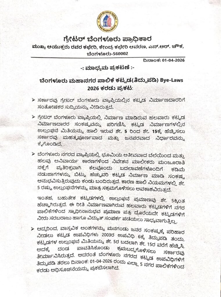 ಬೆಂಗಳೂರು: ಗ್ರೇಟರ್ ಬೆಂಗಳೂರು ಪ್ರಾಧಿಕಾರ (ಜಿಬಿಎ) ವ್ಯಾಪ್ತಿಯಲ್ಲಿ ಕಟ್ಟಡ ಉಪವಿಧಿಗಳ ತಿದ್ದುಪಡಿ ಕುರಿತ ಕರಡು ಅಧಿಸೂಚನೆ ಪ್ರಕಟವಾಗಿದ್ದು, ಸಾರ್ವಜನಿಕರಿಂದ ಆಕ್ಷೇಪಣೆ ಮತ್ತು ಸಲಹೆಗಳನ್ನು ಆಹ್ವಾನಿಸಲಾಗಿದೆ.