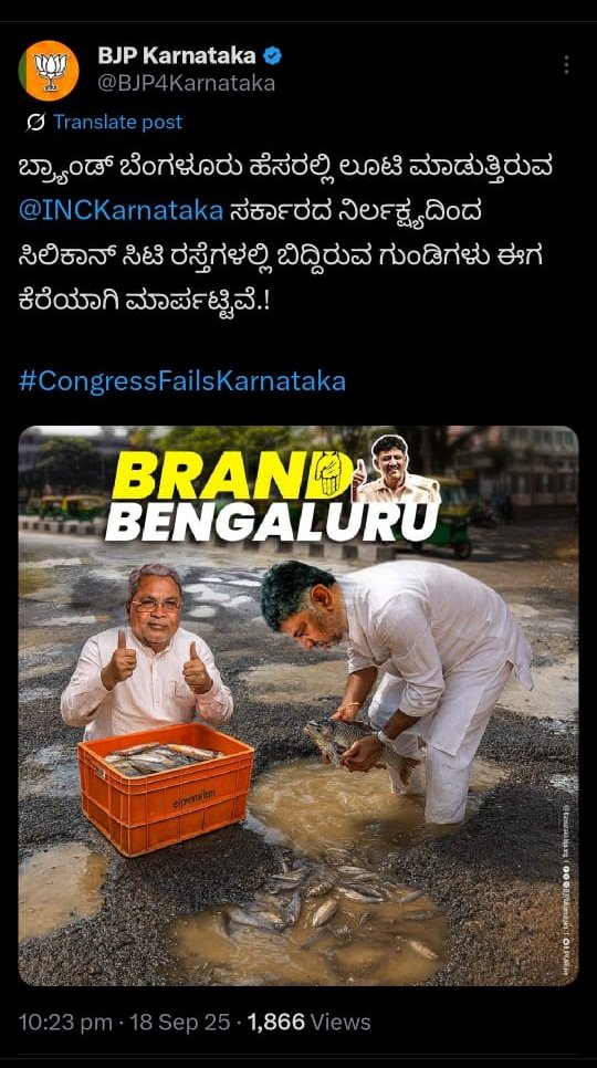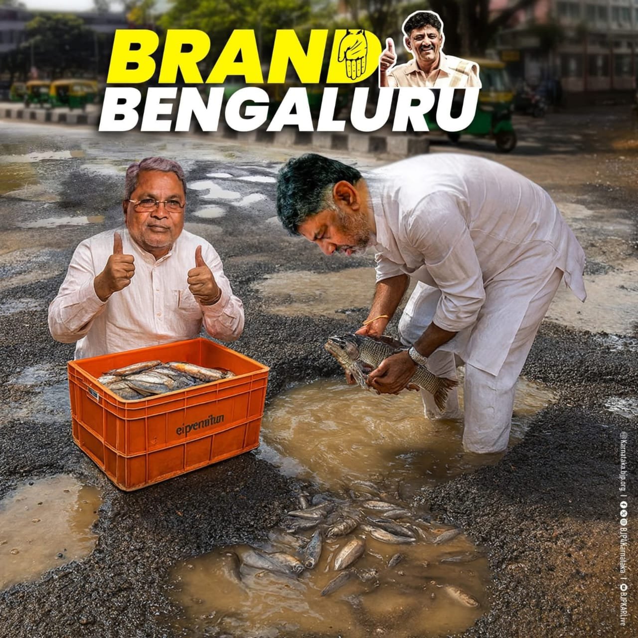 ಬೆಂಗಳೂರು : ಬ್ರ್ಯಾಂಡ್ ಬೆಂಗಳೂರನ್ನು ರಾಜ್ಯ ಕೇಸರಿ ಪಡೆ ಕಾಲೆಳೆದಿದೆ. ಬೆಂಗಳೂರು ರಸ್ತೆಗಳು ಕೆರೆಗಳಾಗಿದ್ದು, ಗುಂಡಿ ಬಿದ್ದಿರುವ ರಸ್ತೆಗಳಲ್ಲಿ ಮೀನು ಹಿಡಿಯುತ್ತಿರುವ ಸಿಎಂ, ಡಿಸಿಎಂ ಪೋಸ್ಟ್ ಅನ್ನು ಅಧಿಕೃತ ಎಕ್ಸ್ ಖಾತೆಯಲ್ಲಿ ಹಾಕಿ ವ್ಯಂಗ್ಯವಾಡಿದೆ.