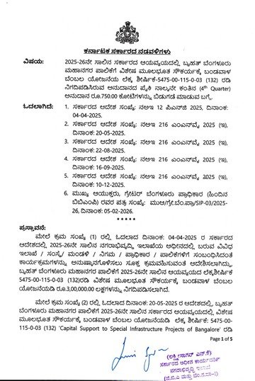 ರಾಜ್ಯ ಸರ್ಕಾರ ಮೂಲ ಸೌಕರ್ಯಕ್ಕಾಗಿ ಜಿಬಿಎಗೆ 3 ಸಾವಿರ ಕೋಟಿ ಅನುದಾನ ನಿಗದಿ ಮಾಡಿತ್ತು. ಇದೀಗ ನಾಲ್ಕನೇ ಕಂತಿನಲ್ಲಿ ವಿಶೇಷ ಮೂಲ ಸೌಕರ್ಯಕ್ಕೆ ಬಂಡವಾಳ ಬೆಂಬಲ ಯೋಜನೆಯಡಿ 2025-26ನೇ ಸಾಲಿನ ಹಣ ರಿಲೀಸ್ ಮಾಡಲಾಗಿದೆ.