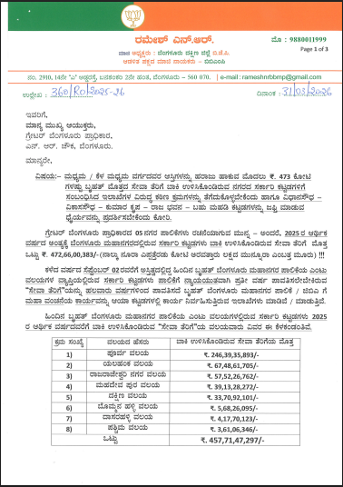 ಈ ಸಂಬಂಧ ಬಿಜೆಪಿ ಮುಖಂಡ ಎನ್‌.ಆರ್. ರಮೇಶ್ ದಾಖಲೆಗಳೊಂದಿಗೆ ಜಿಬಿಎ ಮುಖ್ಯ ಆಯುಕ್ತರು ಹಾಗೂ ಕಂದಾಯ ಇಲಾಖೆಯ ವಿಶೇಷ ಆಯುಕ್ತರಿಗೆ ದೂರು ನೀಡಿದ್ದಾರೆ. ಗ್ರೇಟರ್ ಬೆಂಗಳೂರು ಪ್ರಾಧಿಕಾರ ರಚನೆಯ ಮುನ್ನ, 2025 ಆರ್ಥಿಕ ವರ್ಷದ ಅಂತ್ಯಕ್ಕೆ ನಗರದಲ್ಲಿನ ಸರ್ಕಾರಿ ಕಟ್ಟಡಗಳಲ್ಲಿ ಒಟ್ಟು 472.66 ರೂ. ಕೋಟಿ ಸೇವಾ ತೆರಿಗೆ ಬಾಕಿ ಉಳಿದಿರುವುದು ಬೆಳಕಿಗೆ ಬಂದಿದೆ.