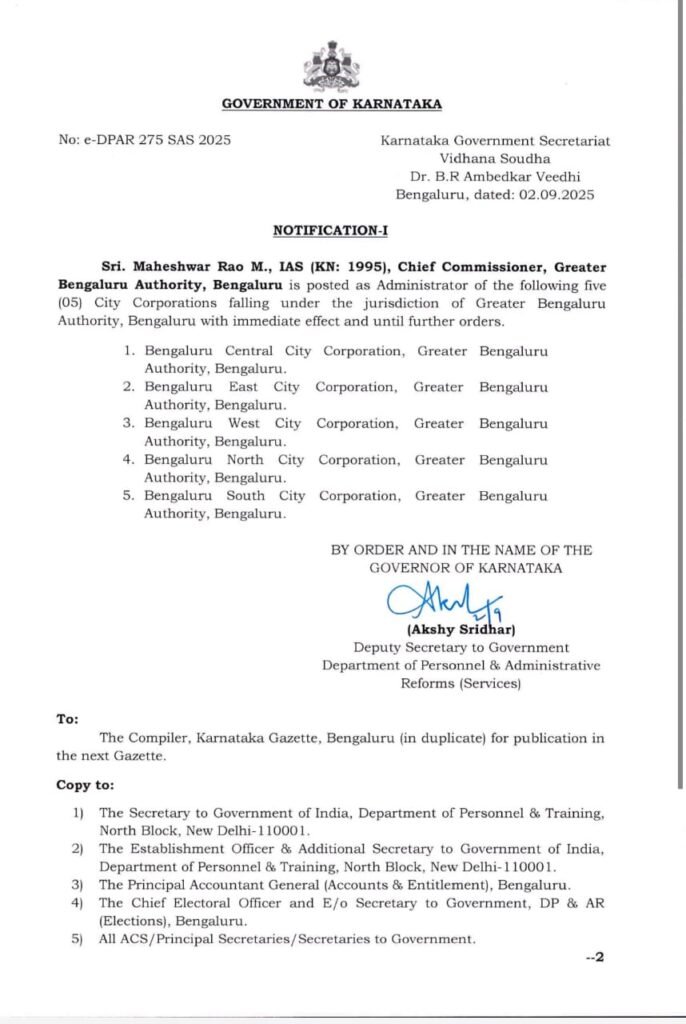 ಜಿಬಿಎ ವ್ಯಾಪ್ತಿಯ ಐದು ನಗರ ಪಾಲಿಕೆಗಳಿಗೆ ಓರ್ವ ಆಡಳಿತಗಾರರನ್ನು ನೇಮಕ ಮಾಡಿದ್ದು, ಜಿಬಿಎ ಮುಖ್ಯ ಆಯುಕ್ತ ಮಹೇಶ್ವರ್ ರಾವ್ ರನ್ನೇ ಆಡಳಿತಗಾರರಾಗಿ ನೇಮಕ ಮಾಡಿ ಆದೇಶ ಹೊರಡಿಸಿದೆ.