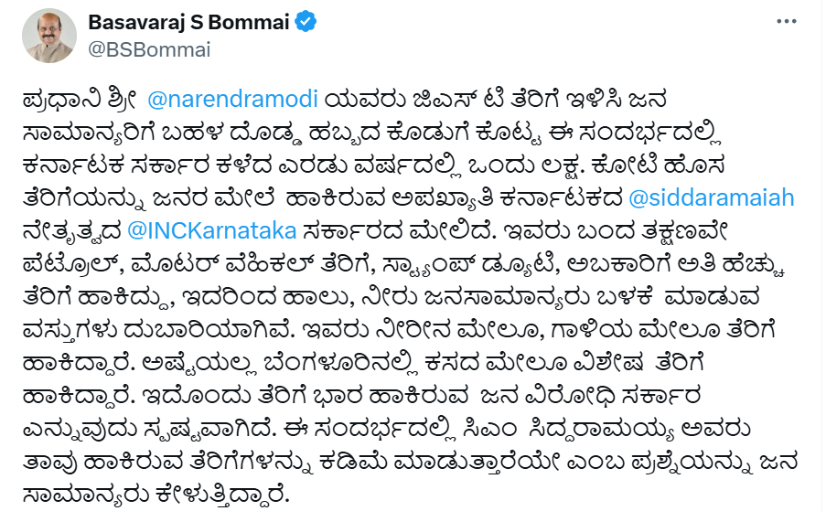 ಪ್ರಧಾನಿ ನರೇಂದ್ರ ಮೋದಿಯವರು ಜಿಎಸ್ಟಿ ತೆರಿಗೆ ಇಳಿಸಿ ಜನ ಸಾಮಾನ್ಯರಿಗೆ ಬಹಳ ದೊಡ್ಡ ಹಬ್ಬದ ಕೊಡುಗೆ ಕೊಟ್ಟ ಈ ಸಂದರ್ಭದಲ್ಲಿ ಕರ್ನಾಟಕ ಸರ್ಕಾರ ಕಳೆದ ಎರಡು ವರ್ಷದಲ್ಲಿ ಒಂದು ಲಕ್ಷ ಕೋಟಿ ಹೊಸ ತೆರಿಗೆಯನ್ನು ಜನರ ಮೇಲೆ ಹಾಕಿರುವ ಅಪಖ್ಯಾತಿ ಸಿದ್ದರಾಮಯ್ಯ ಸರ್ಕಾರದ ಮೇಲಿದೆ. ಇವರು ಬಂದ ತಕ್ಷಣವೇ ಪೆಟ್ರೋಲ್, ಮೊಟರ್ ವೆಹಿಕಲ್ ತೆರಿಗೆ, ಸ್ಟ್ಯಾಂಪ್ ಡ್ಯೂಟಿ, ಅಬಕಾರಿಗೆ ಅತಿ ಹೆಚ್ಚು ತೆರಿಗೆ ಹಾಕಿದ್ದು, ಇದರಿಂದ ಹಾಲು, ನೀರು ಜನಸಾಮಾನ್ಯರು ಬಳಕೆ ಮಾಡುವ ವಸ್ತುಗಳು ದುಬಾರಿಯಾಗಿವೆ. ಇವರು ನೀರಿನ ಮೇಲೂ, ಗಾಳಿಯ ಮೇಲೂ ತೆರಿಗೆ ಹಾಕಿದ್ದಾರೆ. ಅಷ್ಟೆಯಲ್ಲ ಬೆಂಗಳೂರಿನಲ್ಲಿ ಕಸದ ಮೇಲೂ ವಿಶೇಷ ತೆರಿಗೆ ಹಾಕಿದ್ದಾರೆ. ಇದೊಂದು ತೆರಿಗೆ ಭಾರ ಹಾಕಿರುವ ಜನ ವಿರೋಧಿ ಸರ್ಕಾರ ಎನ್ನುವುದು ಸ್ಪಷ್ಟವಾಗಿದೆ. ಈ ಸಂದರ್ಭದಲ್ಲಿ ಸಿಎಂ ಸಿದ್ದರಾಮಯ್ಯ ಅವರು ತಾವು ಹಾಕಿರುವ ತೆರಿಗೆಗಳನ್ನು ಕಡಿಮೆ ಮಾಡುತ್ತಾರೆಯೇ ಎಂಬ ಪ್ರಶ್ನೆಯನ್ನು ಜನ ಸಾಮಾನ್ಯರು ಕೇಳುತ್ತಿದ್ದಾರೆ ಎಂದು ಮಾಜಿ ಸಿಎಂ ಬಸವರಾಜ ಬೊಮ್ಮಾಯಿ ಕಿಡಿಕಾರಿದ್ದಾರೆ.