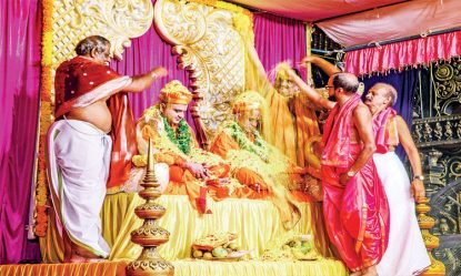 ಗುರುವಂದನೆ ಹಿನ್ನೆಲೆಯಲ್ಲಿ ವೇದಿಕೆಯಲ್ಲಿ ವಿಶೇಷ ಆಸನ ರಚಿಸಿ, ಅದರ ಮೇಲೆ ಶ್ರೀಪಾದ್ವಯರನ್ನು ಕುಳ್ಳಿರಿಸಿ ಪೇಟ ತೊಡಿಸಿ, ಪುಷ್ಪಾರ್ಚನೆ ಸಹಿತವಾಗಿ ವಂದಿಸಲಾಯಿತು.