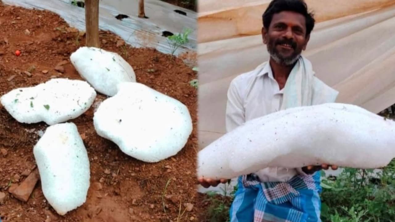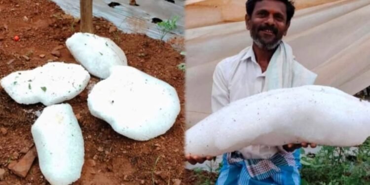 ಪಟ್ಟಣದ ಹೊರವಲಯದಲ್ಲಿರುವ ರೈತನ ತೋಟದಲ್ಲಿ ಈ ದೊಡ್ಡ ಗಾತ್ರದ ಆಲಿಕಲ್ಲುಗಳು ಕಂಡುಬಂದಿದ್ದು, ಇಂದು ಬೆಳಗ್ಗೆ ತೋಟಕ್ಕೆ ತೆರಳಿದ ರೈತ ಅವುಗಳನ್ನು ನೋಡಿ ಅಚ್ಚರಿಗೊಂಡಿದ್ದಾನೆ. ಸಾಮಾನ್ಯವಾಗಿ ಸಣ್ಣ ಗಾತ್ರದ ಆಲಿಕಲ್ಲುಗಳು ಬೀಳುವ ಸಂದರ್ಭಗಳಿಗಿಂತ ಭಿನ್ನವಾಗಿ, ಈ ಬಾರಿ ಬಿದ್ದಿರುವ ಆಲಿಕಲ್ಲುಗಳ ಗಾತ್ರ ದೊಡ್ಡದಾಗಿದ್ದು, ಸ್ಥಳೀಯರಲ್ಲಿ ಕುತೂಹಲ ಮೂಡಿಸಿದೆ.