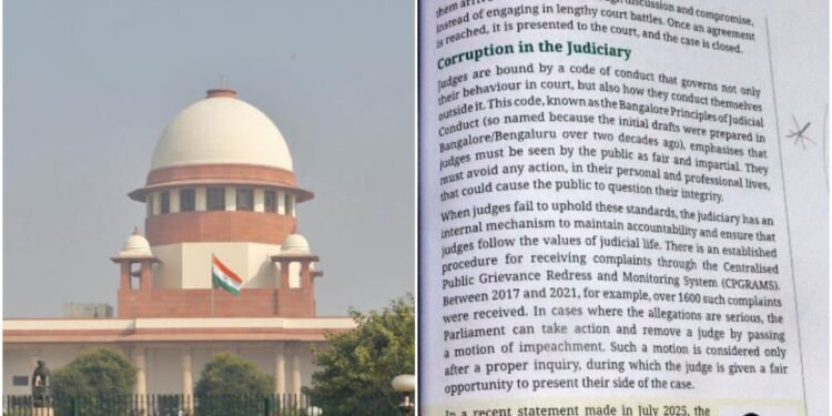 ನವದೆಹಲಿ : 8ನೇ ತರಗತಿಯ ಸಮಾಜ ವಿಜ್ಞಾನ ಪಠ್ಯಪುಸ್ತಕದಲ್ಲಿ ನ್ಯಾಯಾಂಗದಲ್ಲಿನ ಭ್ರಷ್ಟಾಚಾರದ ಕುರಿತು ಉಲ್ಲೇಖಿಸಿರುವುದಕ್ಕೆ ತೀವ್ರ ಆಕ್ರೋಶ ವ್ಯಕ್ತಪಡಿಸಿದ್ದ ಸುಪ್ರೀಂ ಕೋರ್ಟ್, ಇದೀಗ “ಸಂಸ್ಥೆಯನ್ನು ದೂಷಿಸಲು ಯಾರನ್ನೂ ಬಿಡುವುದಿಲ್ಲ” ಎಂದು ಎಚ್ಚರಿಸಿದ್ದು, ತತ್‌ಕ್ಷಣದಿಂದಲೇ ಪುಸ್ತಕವನ್ನು ನಿಷೇಧಿಸಿ ಆದೇಶ ಹೊರಡಿಸಿದೆ. ಅಷ್ಟೇ ಅಲ್ಲದೆ, ಈ ಘಟನೆಗೆ ಕಾರಣರಾದವರ ವಿರುದ್ಧ ಕಠಿಣ ಕ್ರಮ ಜರುಗಿಸಬೇಕು ಮತ್ತು “ತಲೆದಂಡವಾಗಲೇಬೇಕು” ಎಂದು ಕೇಂದ್ರ ಸರ್ಕಾರ ಹಾಗೂ ಎನ್‌ಸಿಇಆರ್‌ಟಿ (NCERT)ಗೆ ಮುಖ್ಯ ನ್ಯಾಯಮೂರ್ತಿ ಸೂರ್ಯ ಕಾಂತ್ ಅವರ ನೇತೃತ್ವದ ಪೀಠ ಖಡಕ್ ಸೂಚನೆ ನೀಡಿದೆ.