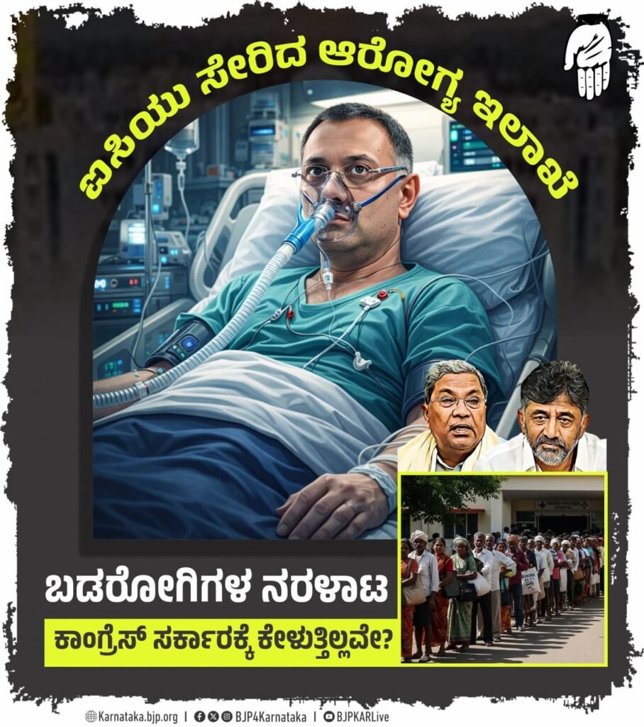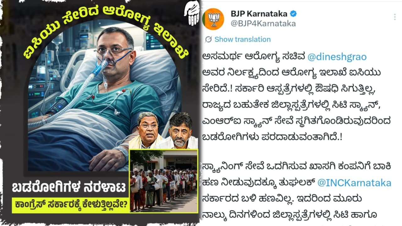 ಸರ್ಕಾರಿ ಆಸ್ಪತ್ರೆಗಳಲ್ಲಿ ಅಗತ್ಯ ಔಷಧಿಗಳು ಲಭ್ಯವಿಲ್ಲ. ರಾಜ್ಯದ ಬಹುತೇಕ ಜಿಲ್ಲಾಸ್ಪತ್ರೆಗಳಲ್ಲಿ ಸಿಟಿ ಸ್ಕ್ಯಾನ್ ಹಾಗೂ ಎಂಆರ್ಐ ಸ್ಕ್ಯಾನ್ ಸೇವೆಗಳು ಸ್ಥಗಿತಗೊಂಡಿವೆ. ಇದರಿಂದ ಬಡ ರೋಗಿಗಳು ಸಂಕಷ್ಟ ಅನುಭವಿಸುತ್ತಿದ್ದಾರೆ ಎಂದು ಬಿಜೆಪಿ ಸಾಮಾಜಿಕ ಜಾಲತಾಣವಾದ ತಮ್ಮ ಎಕ್ಸ್ನಲ್ಲಿ ಪೋಸ್ಟ್ ಮಾಡುವ ಮೂಲಕ ಆಕ್ರೋಶ ಹೊರಹಾಕಿದೆ.