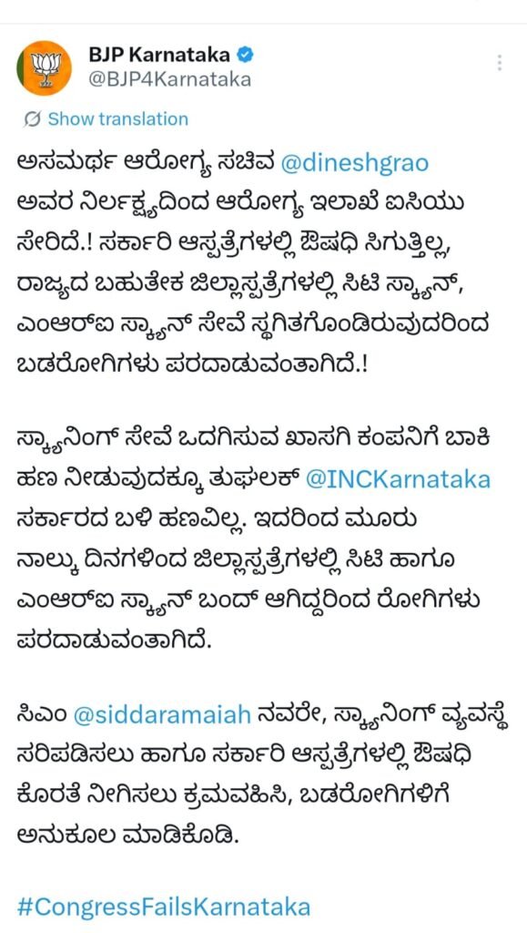 ಸ್ಕ್ಯಾನಿಂಗ್ ಸೇವೆ ಒದಗಿಸುತ್ತಿರುವ ಖಾಸಗಿ ಕಂಪನಿಗೆ ಬಾಕಿ ಹಣ ಪಾವತಿಸಲು ಕಾಂಗ್ರೆಸ್ ಸರ್ಕಾರದ ಬಳಿ ಹಣವಿಲ್ಲದ ಪರಿಸ್ಥಿತಿ ಉಂಟಾಗಿದೆ ಎಂದು ಆರೋಪಿಸಿದೆ. ಕಳೆದ ಮೂರು–ನಾಲ್ಕು ದಿನಗಳಿಂದ ಹಲವಾರು ಜಿಲ್ಲಾಸ್ಪತ್ರೆಗಳಲ್ಲಿ ಸಿಟಿ ಹಾಗೂ ಎಂಆರ್ಐ ಸ್ಕ್ಯಾನ್ ಸೇವೆಗಳು ಬಂದ್ ಆಗಿದ್ದು, ರೋಗಿಗಳು ಪರದಾಡುವಂತಾಗಿದೆ ಎಂದು ದೂರಿದೆ.