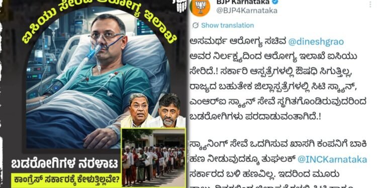 ಬೆಂಗಳೂರು : ರಾಜ್ಯದ ಆರೋಗ್ಯ ಇಲಾಖೆಯ ಕಾರ್ಯವೈಖರಿಯ ಕುರಿತು ಬಿಜೆಪಿ ತೀವ್ರ ಆಕ್ರೋಶ ವ್ಯಕ್ತಪಡಿಸಿದ್ದು, ಆರೋಗ್ಯ ಸಚಿವ ದಿನೇಶ್ ಗುಂಡೂರಾವ್ ಅವರ ನಿರ್ಲಕ್ಷ್ಯದಿಂದ ಆರೋಗ್ಯ ಇಲಾಖೆ ಐಸಿಯು ಸೇರಿದೆ ಎಂದು ಬಿಜೆಪಿ ಆರೋಪಿಸಿದೆ.