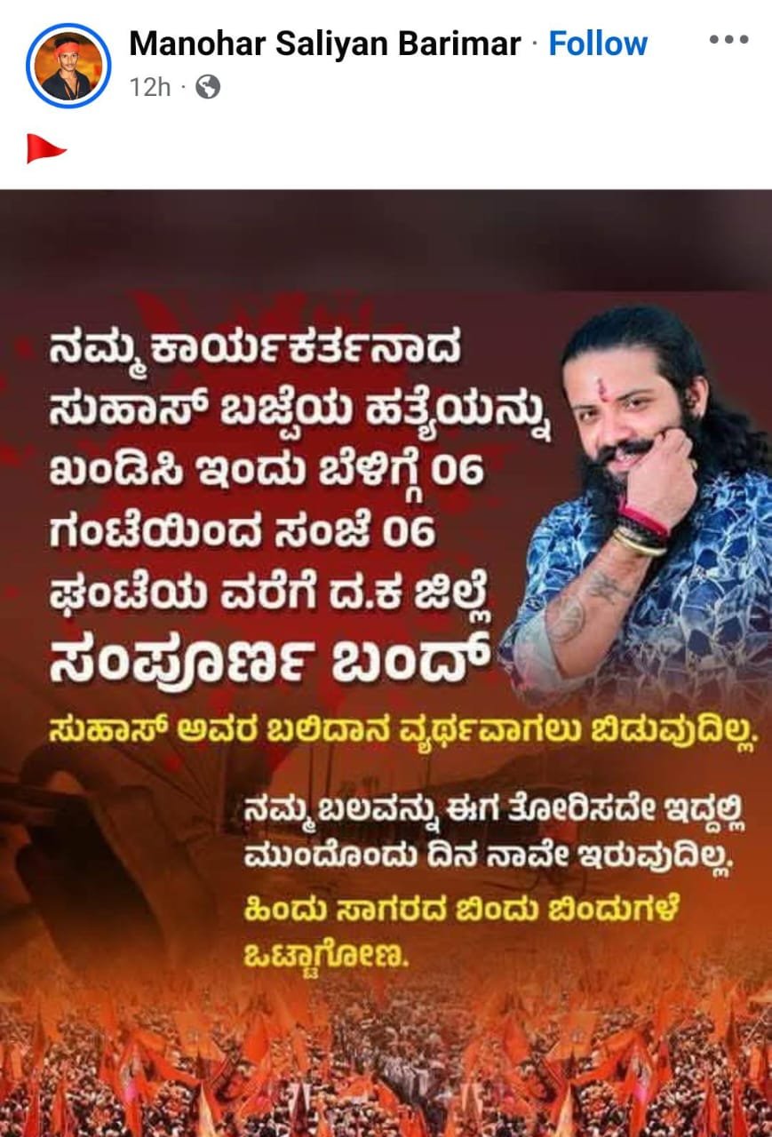 . ಅಶ್ರಫ್ ಕೊಲೆ ಬಳಿಕ ಪ್ರತೀಕಾರವಾಗಿ ಶರತ್ ಮಡಿವಾಳ ಹತ್ಯೆಯಾಗಿತ್ತು. ಅಶ್ರಫ್ ಕೊಂದ ಭರತ್ ನನ್ನ ಮರೆತಿಲ್ಲ. Wait and watch ಎಂದು ಕೇವಲ ಎಂಟು ಗಂಟೆ ಮೊದಲು On fixed leader ಎಂಬ ಹೆಸರಿನ ಇನ್ಸ್ಟಾಗ್ರಾಂ ಪೇಜ್ನಲ್ಲಿ ಮತ್ತೊಂದು ಪೋಸ್ಟ್ ಹಂಚಿಕೊಳ್ಳಲಾಗಿದೆ.