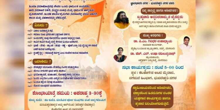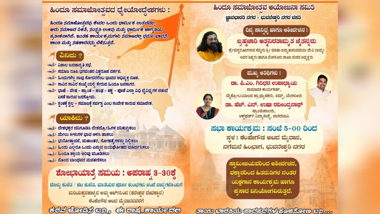 ಬೆಂಗಳೂರು : ಹಿಂದೂ ಸಮಾಜೋತ್ಸವ ಆಯೋಜನಾ ಸಮಿತಿ ವತಿಯಿಂದ ಜ್ಙಾನ ಭಾರತಿ- ಭುವನೇಶ್ವರಿ ನಗರ ವಸತಿಯಲ್ಲಿ ಜ.25 ಭಾನುವಾರದಂದು ಹಿಂದೂ ಸಮಾಜೋತ್ಸವ ಕಾರ್ಯಕ್ರಮ ಆಯೋಜಿಸಲಾಗಿದೆ.