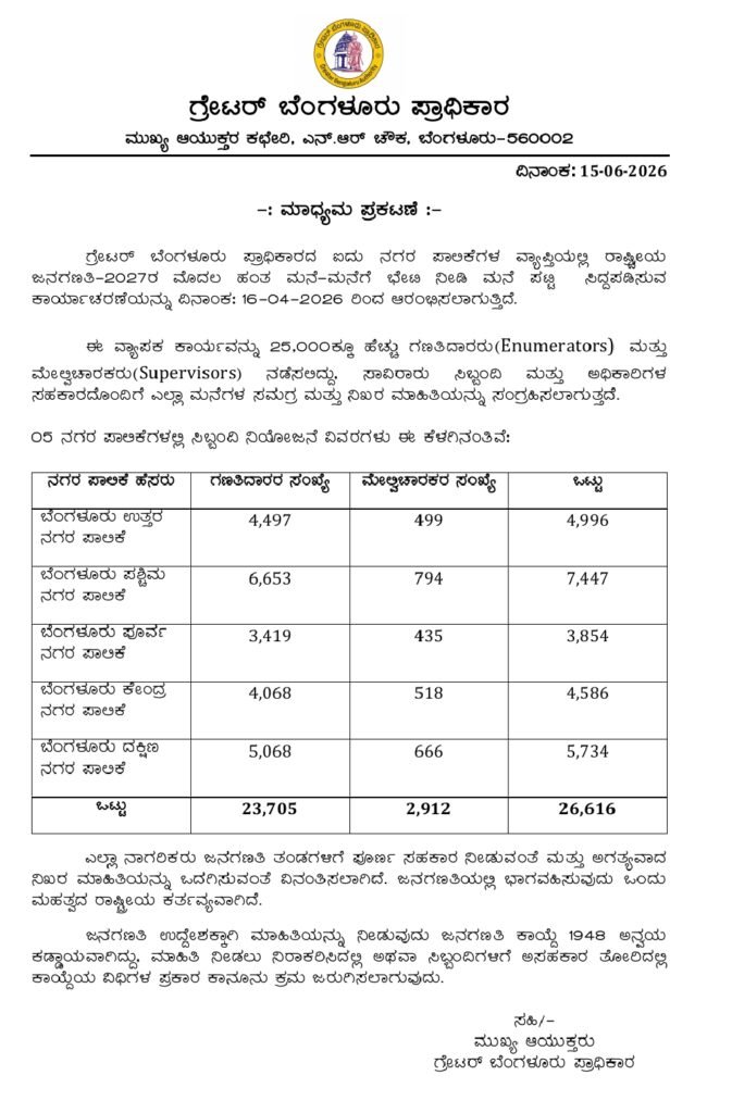 ಬೆಂಗಳೂರು : ಬೆಂಗಳೂರಲ್ಲಿ ಜನಗಣತಿ ಕಾರ್ಯಕ್ಕೆ ಇಂದು ಚಾಲನೆ ನೀಡಲಾಗಿದ್ದು, ಗ್ರೇಟರ್ ಬೆಂಗಳೂರು ಆಡಳಿತ (GBA) ವ್ಯಾಪ್ತಿಯ ಪಂಚ ಪಾಲಿಕೆಗಳಲ್ಲಿ ಮನೆ ಮನೆ ಸಮೀಕ್ಷೆ ಆರಂಭವಾಗಿದೆ. ಜನಗಣತಿ-2027ಕ್ಕೆ ಸಿದ್ಧತೆ ಮಾಡಿಕೊಂಡಿರುವ ಜಿಬಿಎ, ಒಟ್ಟು 26,616 ಸಿಬ್ಬಂದಿಯನ್ನು ನಿಯೋಜಿಸಿದೆ. ಇದರಲ್ಲಿ 23,705 ಗಣತಿದಾರರು ಮತ್ತು 2,912 ಮೇಲ್ವಿಚಾರಕರು ಸೇರಿದ್ದಾರೆ.