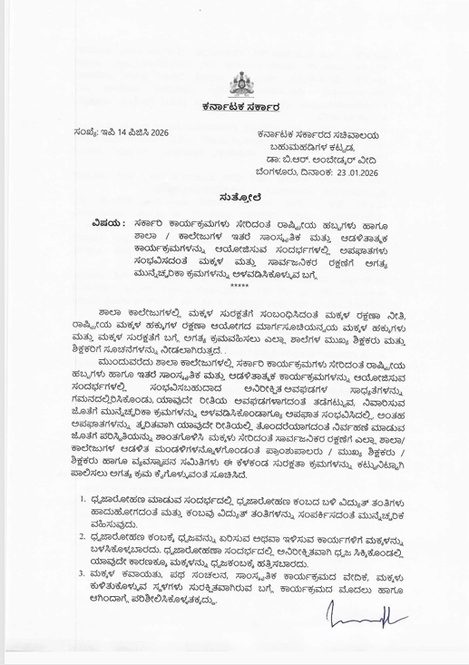 ಬೆಂಗಳೂರು : ಶಾಲೆಗಳಲ್ಲಿ ವಿದ್ಯಾರ್ಥಿಗಳ ಸುರಕ್ಷತೆ ಸಂಬಂಧ ಸಾರ್ವಜನಿಕ ಶಿಕ್ಷಣ ಇಲಾಖೆ ಕೆಲವು ಮಹತ್ವದ ಆದೇಶ ಹೊರಡಿಸಿದೆ. ರಾಷ್ಟ್ರೀಯ ಹಬ್ಬಗಳು, ಸಾಂಸ್ಕೃತಿಕ, ಆಡಳಿತಾತ್ಮಕ ಮತ್ತು ಸರ್ಕಾರಿ ಕಾರ್ಯಕ್ರಮಗಳ ಆಯೋಜನೆ ವೇಳೆ ಮುನ್ನೆಚ್ಚರಿಕೆ ಕೈಗೊಳ್ಳುವಂತೆ ಮಾರ್ಗಸೂಚಿ ಹೊರಡಿಸಲಾಗಿದೆ. ಶಾಲಾ ಕಾಲೇಜುಗಳು ಕಡ್ಡಾಯವಾಗಿ ಮಾರ್ಗಸೂಚಿ ಪಾಲಿಸುವಂತೆ ಸೂಚಿಸಲಾಗಿದೆ.