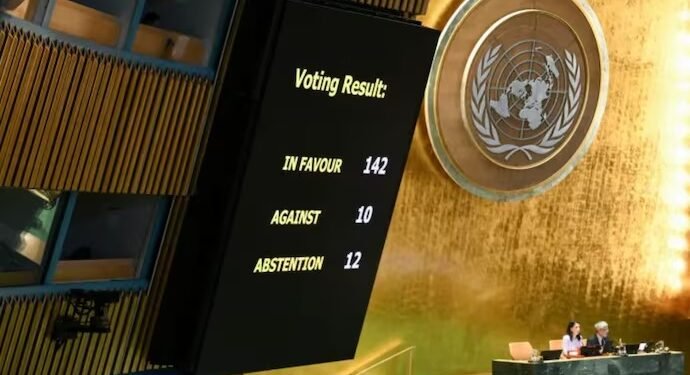 ಫ್ರಾನ್ಸ್ ಮಂಡಿಸಿದ ನಿರ್ಣಯವು ಭಾರೀ ಬಹುಮತದೊಂದಿಗೆ ಅಂಗೀಕರಿಸಲ್ಪಟ್ಟಿದ್ದು, 142 ರಾಷ್ಟ್ರಗಳು ಬೆಂಬಲಿಸಿದರೆ, 10 ವಿರೋಧಿಸಿದವು ಮತ್ತು 12 ದೇಶಗಳು ಮತದಾನದಿಂದ ದೂರ ಉಳಿದವು. ಭಾರತ ಸೇರಿದಂತೆ ಎಲ್ಲಾ ಗಲ್ಫ್ ಅರಬ್ ರಾಷ್ಟ್ರಗಳು ಬೆಂಬಲ ನೀಡಿದರೆ, ಇಸ್ರೇಲ್, ಅಮೆರಿಕ, ಅರ್ಜೆಂಟಿನಾ, ಹಂಗೇರಿ ಸೇರಿದಂತೆ 10 ರಾಷ್ಟ್ರಗಳು ವಿರೋಧಿಸಿದವು.