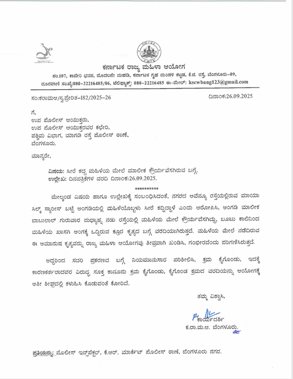ಬೆಂಗಳೂರು: ನಗರದ ಅವೆನ್ಯೂ ರಸ್ತೆಯ ಮಾಯಾ ಸಿಲ್ಕ್ ಆ್ಯಂಡ್ ಸಾರೀಸ್ ಅಂಗಡಿ ಮಾಲಿಕನೊಬ್ಬ ನಿನ್ನೆ (ಗುರುವಾರ) ಮಹಿಳೆಗೆ ಅಮಾನುಷವಾಗಿ ಥಳಿಸಿರುವ ಘಟನೆಯನ್ನು ರಾಜ್ಯ ಮಹಿಳಾ ಆಯೋಗ ತೀವ್ರವಾಗಿ ಖಂಡಿಸಿ, ಈ ಕೃತ್ಯಕ್ಕೆ ಕಾರಣಕರ್ತರಾದವ ವಿರುದ್ಧ ಸೂಕ್ತ ಕ್ರಮ ಕೈಗೊಳ್ಳುವಂತೆ ಆದೇಶಿಸಿ ಪೊಲೀಸರಿಗೆ ಪತ್ರ ಬರೆದಿದೆ.