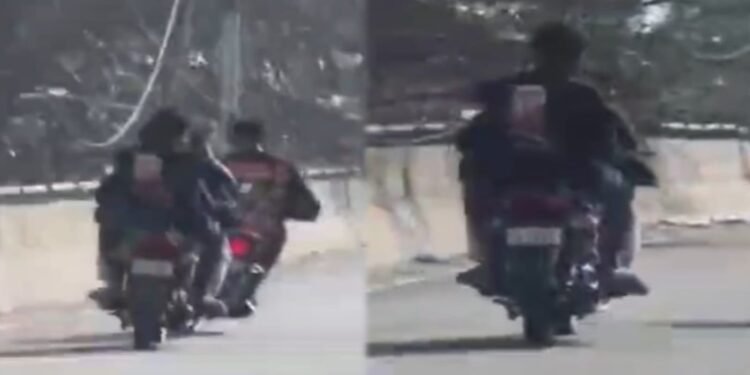 ಜಿಗ್ ಜಾಗ್ ಮಾದರಿಯಲ್ಲಿ ಬೈಕ್ ಓಡಿಸುತ್ತಿದ್ದು, ಇಬ್ಬರು ಸ್ಟಂಟ್ ಮಾಡುತ್ತಿದ್ದರೆ ಇನ್ನಿಬ್ಬರು ವಿಡಿಯೋ ಮಾಡುತ್ತಿರುವ ದೃಶ್ಯ ಬೆಳಕಿಗೆ ಬಂದಿದೆ.