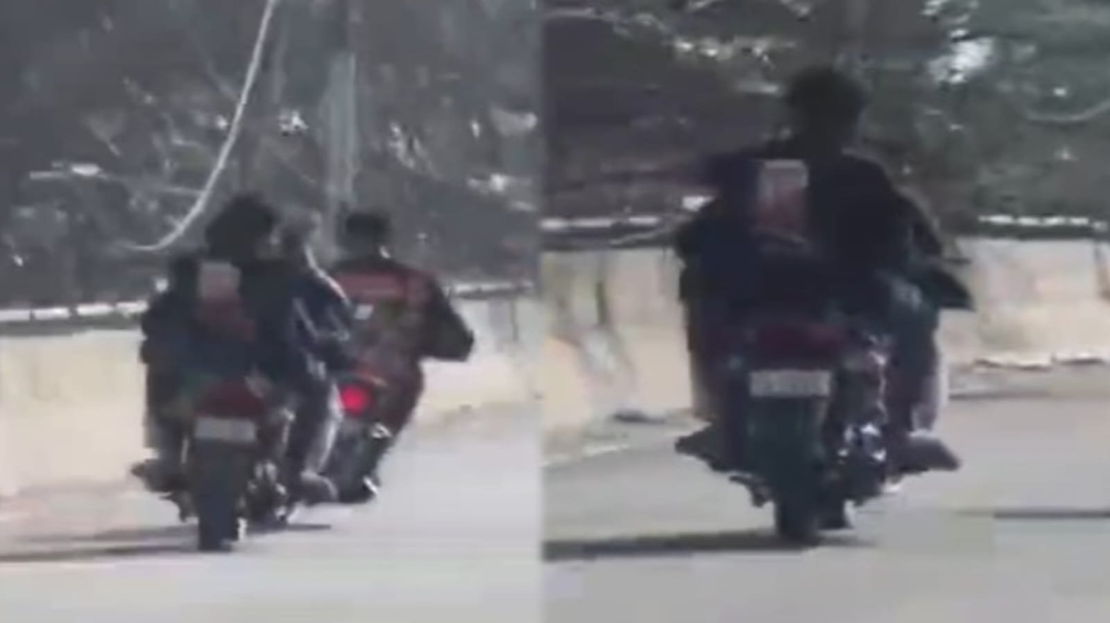 ಜಿಗ್ ಜಾಗ್ ಮಾದರಿಯಲ್ಲಿ ಬೈಕ್ ಓಡಿಸುತ್ತಿದ್ದು, ಇಬ್ಬರು ಸ್ಟಂಟ್ ಮಾಡುತ್ತಿದ್ದರೆ ಇನ್ನಿಬ್ಬರು ವಿಡಿಯೋ ಮಾಡುತ್ತಿರುವ ದೃಶ್ಯ ಬೆಳಕಿಗೆ ಬಂದಿದೆ.