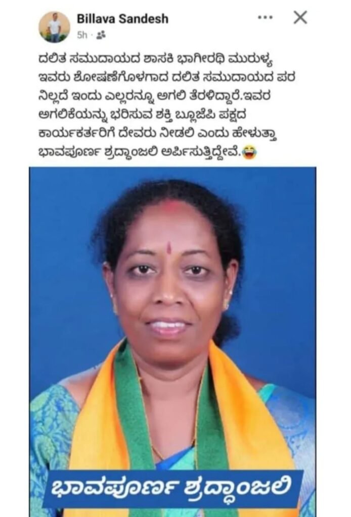 ಬಿಲ್ಲವ ಸಂದೇಶ್ ಎನ್ನುವ ಫೇಸ್ ಬುಕ್ ಖಾತೆಯಲ್ಲಿ ಶ್ರದ್ಧಾಂಜಲಿ ಪೋಸ್ಟ್ ಹಾಕಲಾಗಿತ್ತು. ‘ದಲಿತ ಸಮುದಾಯದ ಶಾಸಕಿ ಭಾಗೀರಥಿ ಮುರುಳ್ಳ ಇವರು, ಶೋಷಣೆಗೊಳಗಾದ ದಲಿತ ಸಮುದಾಯದ ಪರ ನಿಲ್ಲದೆ ಇಂದು ಎಲ್ಲರನ್ನೂ ಅಗಲಿದ್ದಾರೆ. ಇವರ ಅಗಲಿಕೆಯನ್ನು ಭರಿಸುವ ಶಕ್ತಿ ಬ್ಲೂಜೆಪಿ ಪಕ್ಷದ ಕಾರ್ಯಕರ್ತರಿಗೆ ದೇವರು ನೀಡಲಿ ಎಂದು ಹೇಳುತ್ತಾ ಭಾವಪೂರ್ಣ ಶ್ರದ್ಧಾಂಜಲಿ ಅರ್ಪಿಸುತ್ತಿದ್ದೇವೆʼ ಎಂದು ಬರೆಯಲಾಗಿತ್ತು.