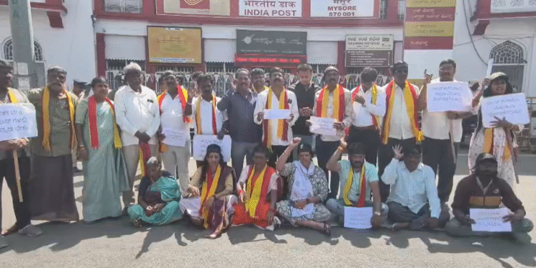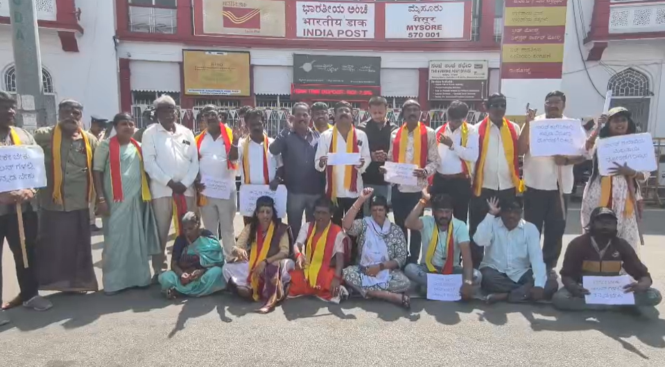 ಮೈಸೂರು: ನಗರದಲ್ಲಿ ಅಶೋಕ ರಸ್ತೆಯ ಪೋಸ್ಟ್ ಆಫೀಸ್‌ಗಳಲ್ಲಿ ಕನ್ನಡ ಚಲನ್‌ ಬಳಸಿ ಎಂದು ಕನ್ನಡ ಸೇನಾ ಪಡೆ ಸಂಘಟನೆಯ ಸದಸ್ಯರು ಪ್ರತಿಭಟನೆ ಮಾಡಿದ್ದಾರೆ.