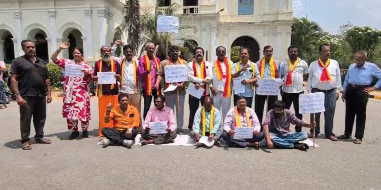 ಬೆಂಗಳೂರು : ವಿದ್ಯುತ್, ಆಸ್ತಿ ಹಾಗೂ ನೀರಿನ ದರ ಏರಿಕೆ ಹಿನ್ನೆಲೆ ಮೈಸೂರಿನಲ್ಲಿ ಕರ್ನಾಟಕ ಸೇನಾ ಪಡೆ ವತಿಯಿಂದ ಪ್ರತಿಭಟನೆ ನಡೆಸಲಾಗಿದೆ. ನಗರದ ಹಳೇ ಜಿಲ್ಲಾಧಿಕಾರಿ ಕಚೇರಿ ಮುಂಭಾಗ ಪ್ರತಿಭಟನಾಕಾರರು ಜಮಾಯಿಸಿ ರಾಜ್ಯ ಸರ್ಕಾರದ ವಿರುದ್ಧ ಆಕ್ರೋಶ ವ್ಯಕ್ತಪಡಿಸಿದ್ದಾರೆ. ದರ ಏರಿಕೆ ವಿರೋಧಿಸಿ ಘೋಷಣೆಗಳನ್ನು ಕೂಗಿ ಸರ್ಕಾರದ ನೀತಿಯನ್ನು ಖಂಡಿಸಿದ್ದಾರೆ.