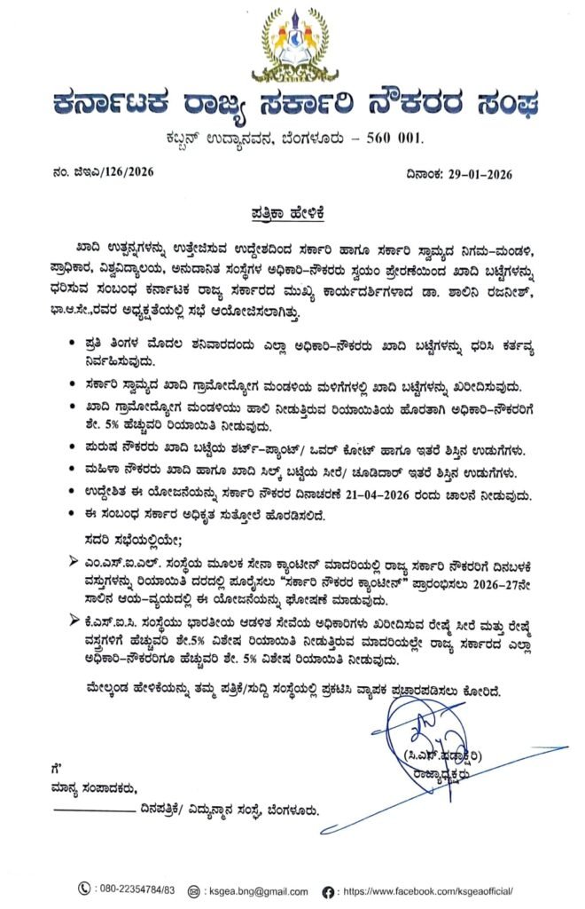 ಸರ್ಕಾರಿ ನೌಕರರು ಖಾದಿ ಉಡುಪು ಧರಿಸುವ ಸಂಬಂಧ ರಾಜ್ಯಾಧ್ಯಕ್ಷರಾದ ಸಿಎಸ್ ಷಡಾಕ್ಷರಿಯವರು ಸರ್ಕಾರದ ಮುಖ್ಯ ಕಾರ್ಯದರ್ಶಿಯವರಾದ ಡಾ. ಶ್ರೀಮತಿ ಶಾಲಿನಿ ರಜನೀಶ್ ರವರ ನೇತೃತ್ವದಲ್ಲಿ ನಡೆದ ಸಭೆಯಲ್ಲಿ ಖಾದಿ ಬಟ್ಟೆ ಧರಿಸುವ ಕುರಿತು ಚರ್ಚೆ ನಡೆಸಿದ್ದು, ಈ ಸಭೆಯಲ್ಲಿ ಮಹತ್ವದ ನಿರ್ಧಾರ ಕೈಗೊಳ್ಳಲಾಗಿದೆ.