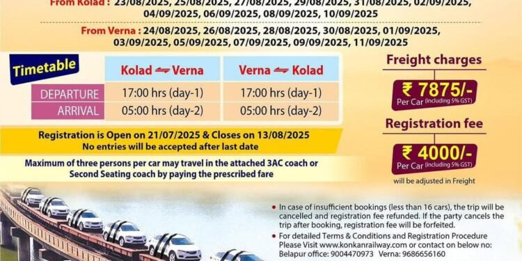 ಕೊಂಕಣ ರೈಲ್ವೆ ಬಿಡುಗಡೆ ಮಾಡಿರುವ ಪ್ರಕಟಣೆಯಲ್ಲಿ, ಈ ಸೇವೆ ಆಗಸ್ಟ್ 23ರಂದು ಮಹಾರಾಷ್ಟ್ರದ ಕೋಲಾಡ್ ನಿಂದ ಗೋವಾದ ವರ್ಣಾಕ್ಕೆ ಬರಲಿದೆ. ಆಗಸ್ಟ್ 24ರಂದು ಗೋವಾದ ವರ್ಣಾದಿಂದ ಕೋಲಾಡ್ ಗೆ ಮರಳಲಿದ್ದು, ಸೆಪ್ಟೆಂಬರ್ 11ರವರೆಗೆ ಇದೇ ರೀತಿ ಮುಂದುವರಿಯಲಿದೆ.