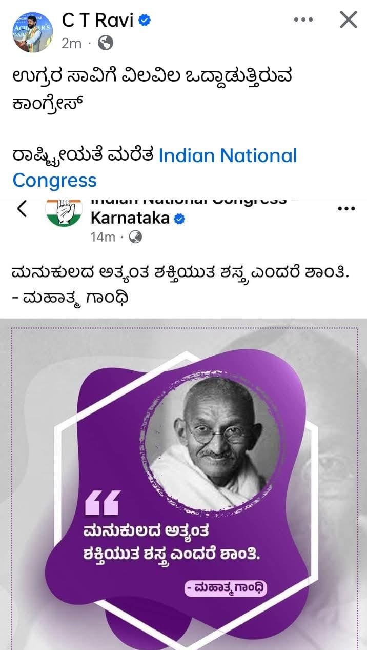 ಕರ್ನಾಟಕ ಕಾಂಗ್ರೆಸ್ (Karnataka Congress) ಮಹಾತ್ಮ ಗಾಂಧೀಜಿ ಅವರ ಸಂದೇಶ ಹಂಚಿಕೊಂಡಿದ್ದು ಮತ್ತೆ ಎಡವಟ್ಟು ಮಾಡಿಕೊಂಡಿದೆ. ಆಪರೇಷನ್ ಸಿಂಧೂರʼ (Operation Sindoor)ಯಶಸ್ಸಿನ ನಂತರ ಕಾಂಗ್ರೆಸ್, ಎಕ್ಸ್ ಖಾತೆಯಲ್ಲಿ ಪೋಸ್ಟ್ ಹಂಚಿಕೊಂಡಿದ್ದು, ರಾಜ್ಯ ಕಾಂಗ್ರೆಸ್, ಮಹಾತ್ಮ ಗಾಂಧಿ ಅವರ ʻಮನುಕುಲದ ಅತ್ಯಂತ ಶಕ್ತಿಯುತ ಶಸ್ತ್ರ ಎಂದರೆ ಶಾಂತಿʼ ಎಂಬ ಸಂದೇಶವನ್ನು ಹಂಚಿಕೊಂಡಿದೆ. ಆಗ ಕಾಂಗ್ರೆಸ್ ವಿರುದ್ಧ ನೆಟ್ಟಿಗರು, ಸಾರ್ವಜನಿಕರಿಂದ ತೀವ್ರ ಆಕ್ರೋಶ ವ್ಯಕ್ತಪಡಿಸುತ್ತಿದ್ದಂತೆ ಅದನ್ನು ಡಿಲೀಟ್ ಮಾಡಿದೆ. ಮತ್ತೊಂದು ಪೋಸ್ಟ್ ಹಂಚಿಕೊಂಡು ಸೇನೆಯನ್ನು ಕೊಂಡಾಡಿದೆ.