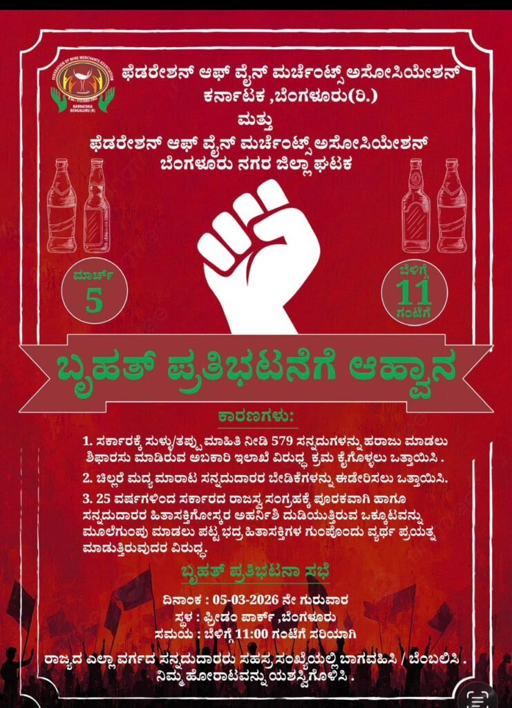 ಫೆಡೆರೇಷನ್ ಆಫ್ ವೈನ್ ಮರ್ಚೆಂಟ್ ಅಸೋಸಿಯೇಷನ್ ವತಿಯಿಂದ ಈ ಹೋರಾಟಕ್ಕೆ ಕರೆ ನೀಡಲಾಗಿದೆ. ನಾಳೆ ಬೆಳಗ್ಗೆ 11 ಗಂಟೆಗೆ ಫ್ರೀಡಂ ಪಾರ್ಕ್ನಲ್ಲಿ ಪ್ರತಿಭಟನೆ ನಡೆಯಲಿದೆ. ಸರ್ಕಾರಕ್ಕೆ ತಪ್ಪು ಮಾಹಿತಿ ನೀಡಿ 579 ಸನ್ನದುಗಳನ್ನು ಹರಾಜು ಮಾಡಲು ಅಬಕಾರಿ ಇಲಾಖೆ ಶಿಫಾರಸು ಮಾಡಿದೆ ಎಂದು ಸಂಘಟನೆ ಆರೋಪಿಸಿದೆ. ಈ ಹಿನ್ನೆಲೆಯಲ್ಲಿ ಅಬಕಾರಿ ಇಲಾಖೆಯ ವಿರುದ್ಧ ತಕ್ಷಣ ಕ್ರಮ ಕೈಗೊಳ್ಳಬೇಕೆಂದು ಆಗ್ರಹಿಸಲಾಗಿದೆ.