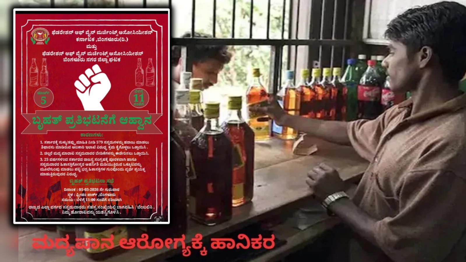 ಫೆಡೆರೇಷನ್ ಆಫ್ ವೈನ್ ಮರ್ಚೆಂಟ್ ಅಸೋಸಿಯೇಷನ್ ವತಿಯಿಂದ ಈ ಹೋರಾಟಕ್ಕೆ ಕರೆ ನೀಡಲಾಗಿದೆ. ನಾಳೆ ಬೆಳಗ್ಗೆ 11 ಗಂಟೆಗೆ ಫ್ರೀಡಂ ಪಾರ್ಕ್ನಲ್ಲಿ ಪ್ರತಿಭಟನೆ ನಡೆಯಲಿದೆ. ಸರ್ಕಾರಕ್ಕೆ ತಪ್ಪು ಮಾಹಿತಿ ನೀಡಿ 579 ಸನ್ನದುಗಳನ್ನು ಹರಾಜು ಮಾಡಲು ಅಬಕಾರಿ ಇಲಾಖೆ ಶಿಫಾರಸು ಮಾಡಿದೆ ಎಂದು ಸಂಘಟನೆ ಆರೋಪಿಸಿದೆ. ಈ ಹಿನ್ನೆಲೆಯಲ್ಲಿ ಅಬಕಾರಿ ಇಲಾಖೆಯ ವಿರುದ್ಧ ತಕ್ಷಣ ಕ್ರಮ ಕೈಗೊಳ್ಳಬೇಕೆಂದು ಆಗ್ರಹಿಸಲಾಗಿದೆ.
