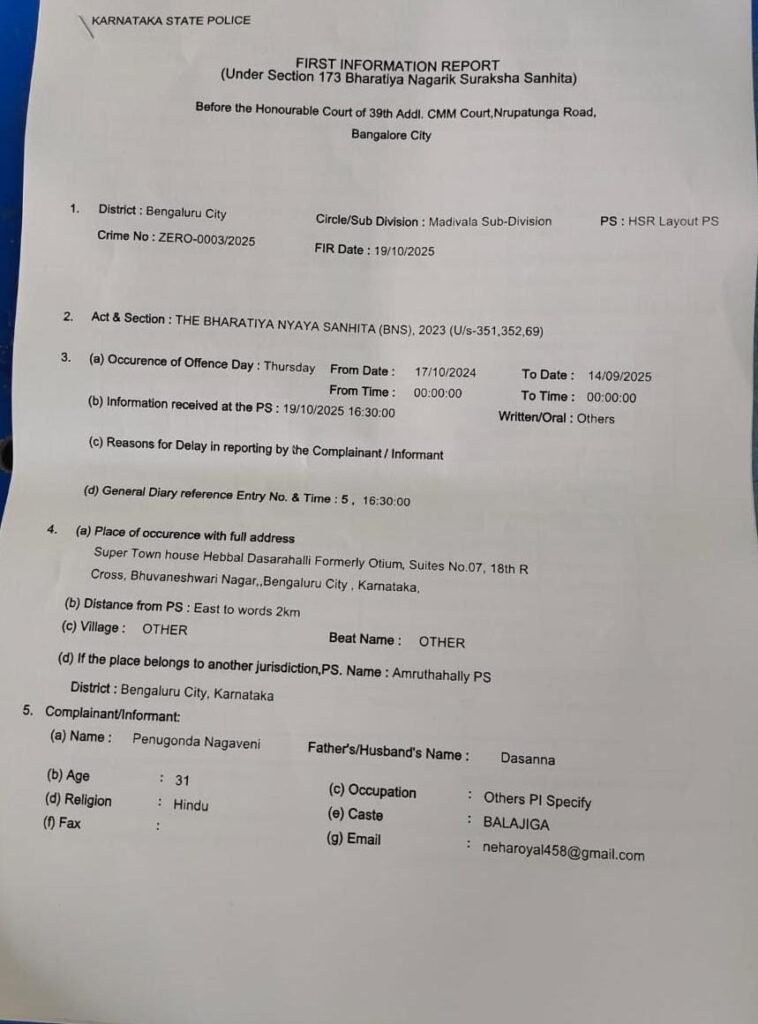 ಸದ್ಯ ಈ ಸಂಬಂಧ ಹೆಚ್ಎಸಾರ್ ಲೇಔಟ್ ಪೊಲೀಸ್ ಠಾಣೆಯಲ್ಲಿ ಪ್ರಕರಣ ದಾಖಲಾಗಿದೆ.