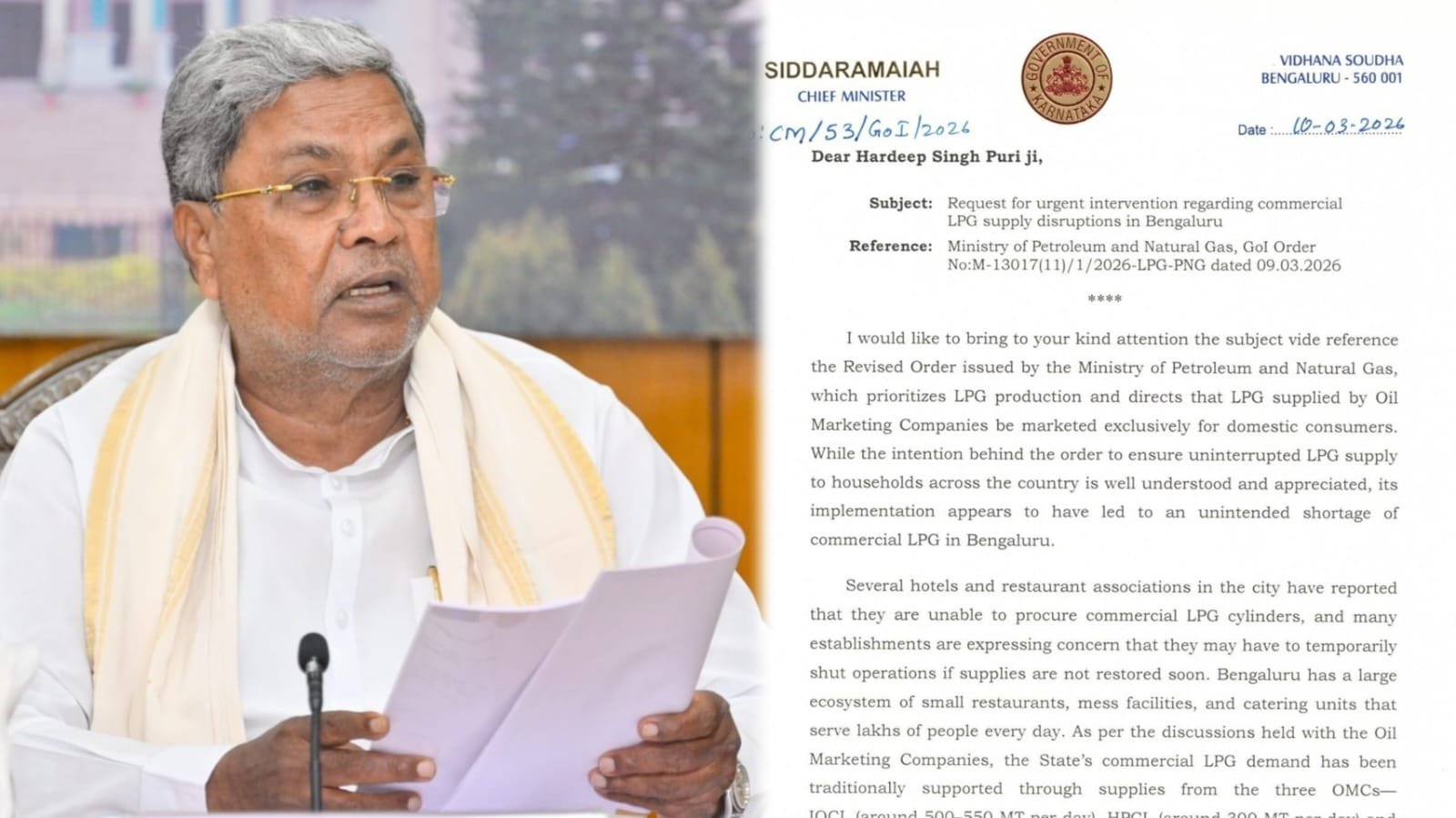 ಮುಖ್ಯಮಂತ್ರಿಗಳ ವಿನಂತಿ : “ಬೆಂಗಳೂರಿನ ಹೋಟೆಲ್ ಮತ್ತು ಕೇಟರಿಂಗ್ ಉದ್ಯಮದ ಹಿತದೃಷ್ಟಿಯಿಂದ ಕೇಂದ್ರ ಸರ್ಕಾರ ತಕ್ಷಣ ಕ್ರಮ ಕೈಗೊಳ್ಳಬೇಕು ಮತ್ತು ವಾಣಿಜ್ಯ ಎಲ್ಪಿಜಿ ಪೂರೈಕೆಯನ್ನು ಶೀಘ್ರದಲ್ಲೇ ಪುನಃಸ್ಥಾಪಿಸಬೇಕು.”