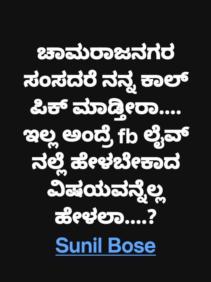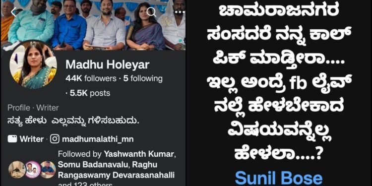 ಚಾಮರಾಜನಗರ | ಸಂಸದ ಸುನಿಲ್ ಬೋಸ್‌ಗೆ ಮಹಿಳೆಯೊಬ್ಬರು ಫೇಸ್‌ ಬುಕ್‌ನಲ್ಲಿ ಕೊಟ್ಟ ವಾರ್ನಿಂಗ್ ಭಾರೀ ಚರ್ಚೆಗೆ ಗ್ರಾಸವಾಗಿದೆ. ಮಧು ಹೊಲೆಯಾರ್ ಹೆಸರಿನ ಮಹಿಳೆ ತನ್ನ ಫೇಸ್ ಬುಕ್ ಖಾತೆಯಲ್ಲಿ ಹಾಕಿರುವ ಮೆಸೇಜ್ ಸಕ್ಕತ್ ವೈರಲ್ ಆಗಿ ನಂತರ ಡಿಲೀಟ್ ಆಗಿದೆ.