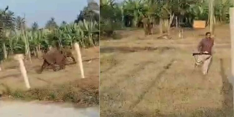 ಏಕಾಂಗಿಯಾಗಿ ಗುಂಡಾಪುರ ಗ್ರಾಮಕ್ಕೆ ಕಾಡಾನೆ ನುಗ್ಗಿದ್ದು, ಇದನ್ನ ಓಡಿಸಲು ಹೋದ ಅರಣ್ಯ ಇಲಾಖೆ ಸಿಬ್ಬಂದಿಯನ್ನು ಹಿಮ್ಮಟ್ಟಿಸಿದೆ. ಪ್ರಾಣ ಭಯದಿಂದ ಅರಣ್ಯ ಇಲಾಖೆ ಸಿಬ್ಬಂದಿ ಪಿಸ್ತೂಲ್ ಹಿಡಿದುಕೊಂಡೇ ಎದ್ನೋ ಬಿದ್ನೋ ಅಂತ ಓಡಿ ಹೋಗಿ ಆನೆಯಿಂದ ತಪ್ಪಿಸಿಕೊಂಡಿದ್ದಾರೆ.
