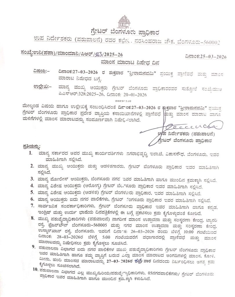 ಗ್ರೇಟರ್ ಬೆಂಗಳೂರು ಪ್ರಾಧಿಕಾರ (GBA) ವ್ಯಾಪ್ತಿಯಲ್ಲಿ ಮಾರ್ಚ್ 27 ರಂದು ನಡೆಯಲಿರುವ ಶ್ರೀರಾಮ ನವಮಿ ಪ್ರಯುಕ್ತ ಈ ಕ್ರಮ ಕೈಗೊಳ್ಳಲಾಗಿದೆ. ಆ ದಿನ ನಗರದಲ್ಲಿರುವ ಎಲ್ಲಾ ಕಸಾಯಿಖಾನೆಗಳಲ್ಲಿ ಪ್ರಾಣಿವಧೆ ನಡೆಸುವುದನ್ನು ಹಾಗೂ ಮಾಂಸ ಮಾರಾಟ ಮಳಿಗೆಗಳಲ್ಲಿ ಮಾಂಸ ಮಾರಾಟವನ್ನು ಸಂಪೂರ್ಣವಾಗಿ ನಿಷೇಧಿಸಲಾಗಿದೆ ಎಂದಿದ್ದಾರೆ.