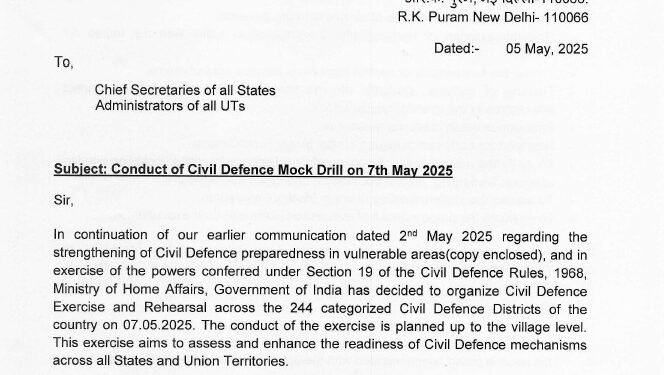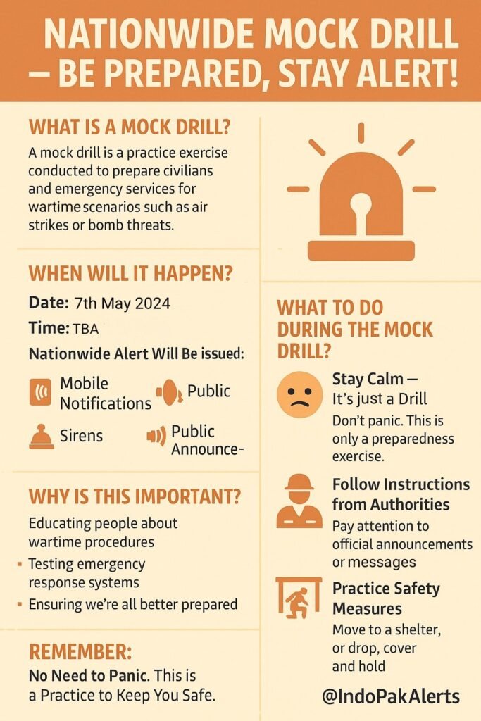 ಅರ್ಧ ಶತಮಾನದ ಬಳಿಕ ನಾಳೆ ಭಾರತದಲ್ಲಿ ಮಾಕ್ ಡ್ರಿಲ್ ನಡೆಯಲಿದೆ. ಯುದ್ಧಕ್ಕೆ ಮುಂಚಿತವಾಗಿ ಪ್ರಜೆಗಳಿಗೆ ತುರ್ತು ಪರಿಸ್ಥಿತಿಯಲ್ಲಿ ಬಚಾವ್ ಆಗುವುದು ಹೇಗೆ ಎನ್ನುವದರ ಡ್ರಿಲ್ ನಾಳೆ ನಡೆಯಲಿದೆ.