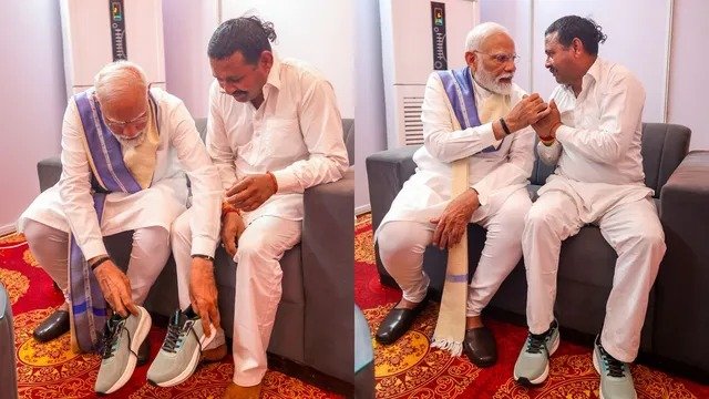 ಚಂಡೀಗಢ: ಕಳೆದ 14 ವರ್ಷಗಳಿಂದ ಬರಿಗಾಲಿನಲ್ಲೇ ತಿರುಗಾಡುತ್ತಿದ್ದ ಅಭಿಮಾನಿಯೊಬ್ಬರಿಗೆ ಪ್ರಧಾನಿ ನರೇಂದ್ರ ಮೋದಿ ಅವರು ಶೂಗಳನ್ನು ತೊಡಿಸುವ ಮೂಲಕ ಅವರ ಪ್ರತಿಜ್ಞೆಯನ್ನು ಈಡೇರಿಸಿದ್ದಾರೆ. ಹರಿಯಾಣದ ಯಮುನಾ ನಗರಕ್ಕೆ ಭೇಟಿ ನೀಡಿದ ನರೇಂದ್ರ ಮೋದಿ (Narendra Modi) ಅವರು ಕೈತಾಲ್ ನವರಾದ ರಾಂಪಾಲ್ ಕಶ್ಯಪ್ ಎಂಬುವರಿಗೆ ಬೂಟುಗಳನ್ನು ತೊಡಿಸುವ ಮೂಲಕ ಅವರ ಪ್ರತಿಜ್ಞೆ ಈಡೇರಿಸಿದ್ದಾರೆ. ಈ ವೀಡಿಯೋ ಈಗ ಸಾಮಾಜಿಕ ಜಾಲತಾಣಗಳಲ್ಲಿ ಭಾರಿ ವೈರಲ್ ಆಗಿದೆ.