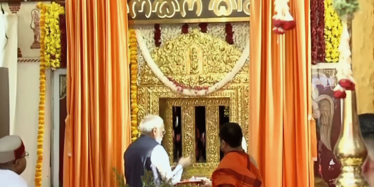 ಉಡುಪಿ : ಪ್ರಧಾನಿ ನರೇಂದ್ರ ಮೋದಿಯವರು ಉಡುಪಿಯ ಕೃಷ್ಣ ಮಠಕ್ಕೆ ಭೇಟಿ ನೀಡಿ, ಕನಕನ ಕಿಂಡಿಯ ಮೂಲಕ ಕೃಷ್ಣ ದರ್ಶನ ಪಡೆದರು. ಈ ಸಂದರ್ಭದಲ್ಲಿ ಅವರು ಸ್ವರ್ಣ ಲೇಪಿತ ತೀರ್ಥ ಮಂಟಪವನ್ನು ಉದ್ಘಾಟಿಸಿ, ಲಕ್ಷಕಂಠ ಭಗವದ್ಗೀತಾ ಸಮಾವೇಶದಲ್ಲಿ ಭಾಗವಹಿಸಿದರು.