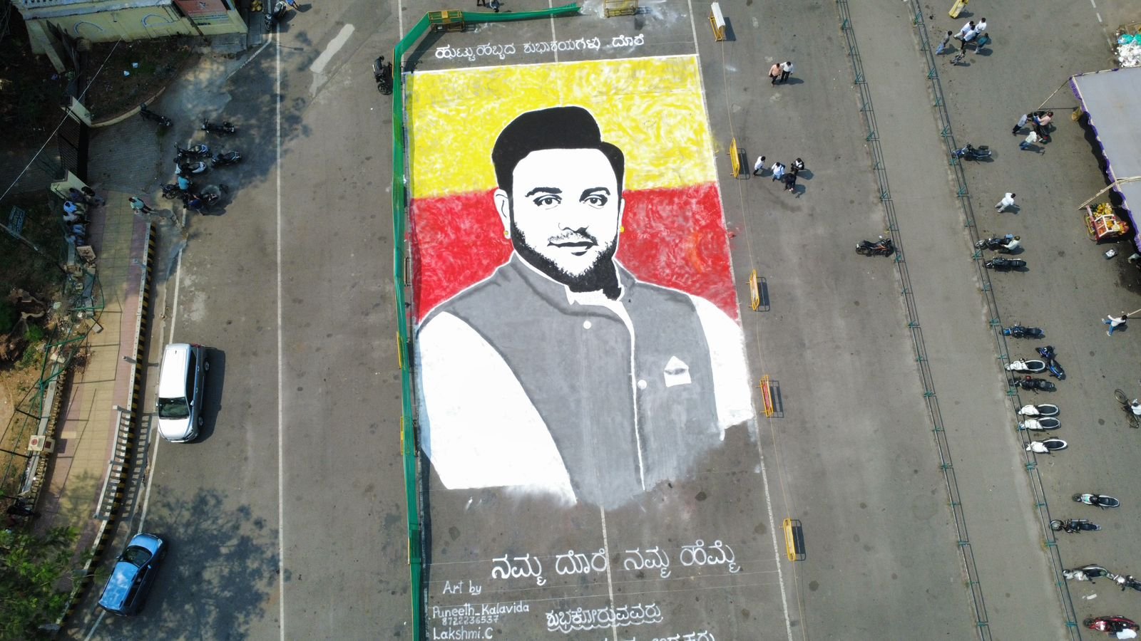 ನಗರದಲ್ಲಿ ಕಲಾವಿದ ಪುನೀತ್ ಮತ್ತು ಅವರ ತಂಡದಿಂದ ಬೃಹತ್ ರಂಗೋಲಿ ಭಾವಚಿತ್ರ ರಚಿಸಲಾಗಿದ್ದು, ಎಲ್ಲರ ಗಮನ ಸೆಳೆಯಿತು. ಸುಮಾರು 8300 ಚದರ ಅಡಿಗಳ ವಿಸ್ತೀರ್ಣದಲ್ಲಿ ಮೂಡಿಬಂದ ಈ ಭಾವಚಿತ್ರದಲ್ಲಿ ಯದುವೀರ್ ಒಡೆಯರ್ ಅವರ ಪ್ರತಿಮೆ ಅದ್ಭುತವಾಗಿ ಮೂಡಿಬಂದಿದೆ.