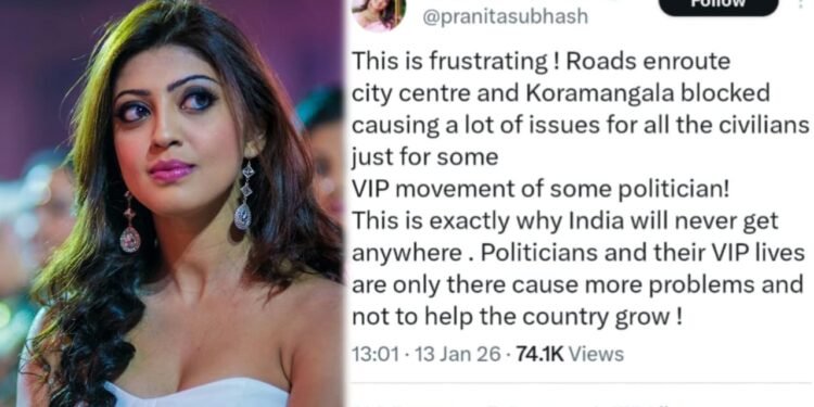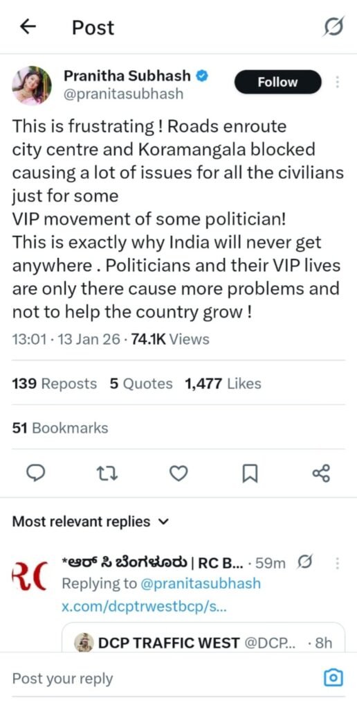 ಕೋರಮಂಗಲ ಭಾಗದಲ್ಲಿ ಇಂದು ಜರ್ಮನಿ ಚಾನ್ಸಿಲರ್ ಭೇಟಿ ಹಿನ್ನೆಲೆ, ರಸ್ತೆ ಮಾರ್ಗಗಳ ಬಂದ್ ಮಾಡಲಾಗಿತ್ತು. ಮಾರ್ಗ ಬಂದ್ ಮಾಡಿದ್ದಕ್ಕಾಗಿ ಇತರೆ ವಾಹನ ಸವಾರರಿಗೆ ಟ್ರಾಫಿಕ್ ಬಿಸಿ ತಟ್ಟಿತ್ತು. ಈ ಬಗ್ಗೆ ಎಕ್ಸ್ ನಲ್ಲಿ ಪೋಸ್ಟ್ ಹಾಕಿ ನಟಿ ಪ್ರಣೀತಾ, ಇದು ತುಂಬಾ ಬೇಸರದ ಸಂಗತಿ. ಕೋರಮಂಗಲಕ್ಕೆ ಹೋಗುವ ರಸ್ತೆಗಳು ಮುಚ್ಚಿ ಹೋಗಿರುವುದರಿಂದ ನಾಗರಿಕರಿಗೆ ಬಹಳಷ್ಟು ಸಮಸ್ಯೆ ಉಂಟಾಗಿದೆ. ಇದು ಕೇವಲ ಕೆಲವು ರಾಜಕಾರಣಿಗಳ, ವಿಐಪಿ ಸಂಚಾರದ ಕಾರಣಕ್ಕಾಗಿ ಇಂತಹ ನಡೆ ಒಳ್ಳೆಯದಲ್ಲ ಎಂದು ತಮ್ಮ ಎಕ್ಸ್ ಖಾತೆಯಲ್ಲಿ ಬರೆದುಕೊಂಡಿದ್ದಾರೆ.