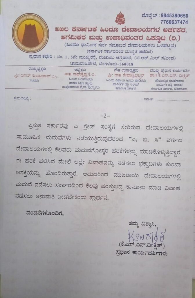 ಮುಜರಾಯಿ ದೇವಸ್ಥಾನಗಳಲ್ಲಿ ಮದುವೆಯಾದ ನಂತರ, ದಂಪತಿ ವಿಚ್ಚೇದನ, ಕಲಹವಾದರೆ ಆ ಪ್ರಕರಣದಲ್ಲಿ ಅರ್ಚಕರನ್ನು ಭಾಗಿ ಮಾಡಬಾರದು, ಯಾವುದೇ ಕಾರಣಕ್ಕೂ ವಿಚಾರಣೆ, ಕೋರ್ಟ್ಗೆ ಕರೀಯಬಾರದು ಈ ರೀತಿಯ ಷರತ್ತುಗಳನ್ನು ಹಾಕಿ ಅನುಮತಿ ಕೊಡುವಂತೆ ತಿಳಿಸಿದ್ದಾರೆ.