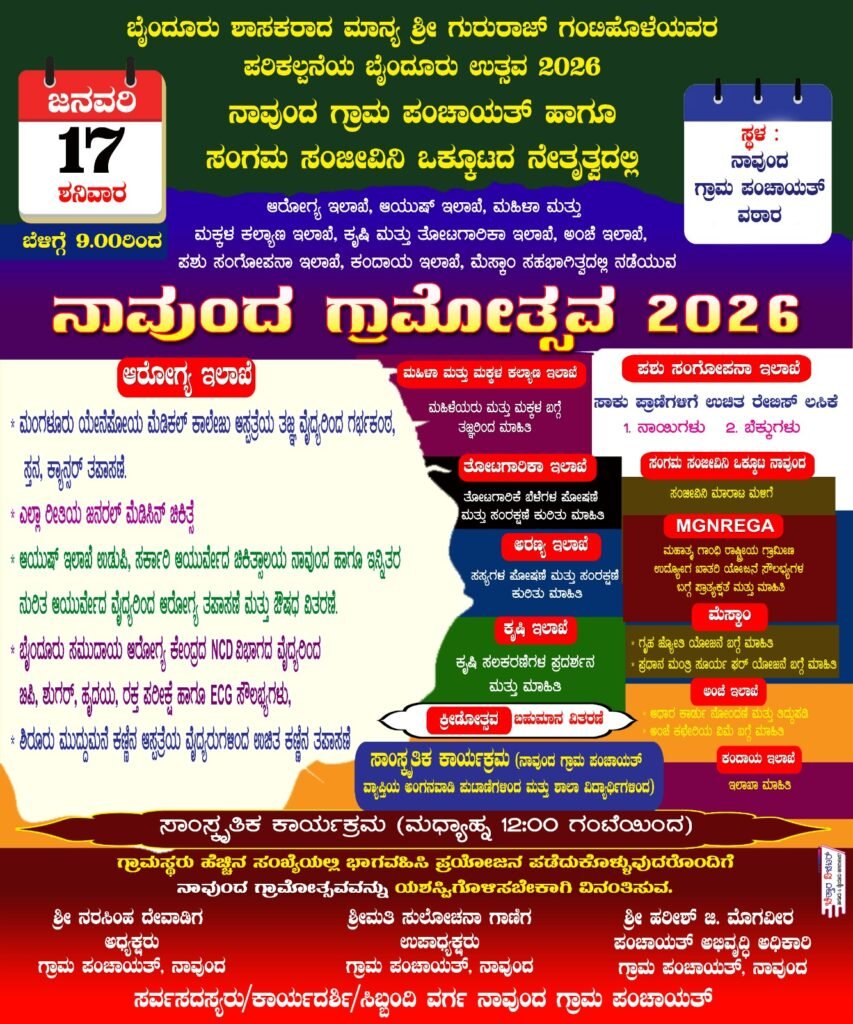 ಕುಂದಾಪುರ | ಶಾಸಕ ಗುರುರಾಜ್ ಗಂಟಿಹೊಳೆಯವರ ಪರಿಕಲ್ಪನೆಯ ಬೈಂದೂರು ಉತ್ಸವ 2026ರ ಅಂಗವಾಗಿ ಬೃಹತ್ ‘ನಾವುಂದ ಗ್ರಾಮೋತ್ಸವ’ ಜನವರಿ 17ರಂದು ನಡೆಯಲಿದ್ದು, ನಾವುಂದ ಗ್ರಾಮ ಪಂಚಾಯತ್ ಹಾಗೂ ಸಂಗಮ ಸಂಜೀವಿನಿ ಒಕ್ಕೂಟದ ಸಹಯೋಗದಲ್ಲಿ ಗ್ರಾಮೋತ್ಸವವನ್ನು ಅತ್ಯಂತ ಅರ್ಥಪೂರ್ಣವಾಗಿ ಆಯೋಜಿಸಲಾಗಿದೆ.