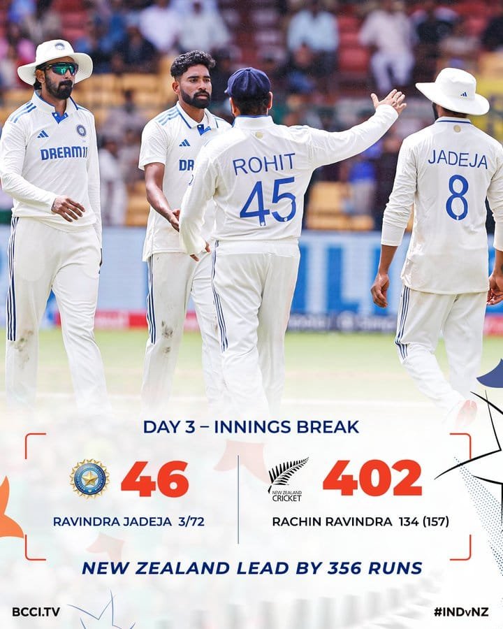 ಭಾರತ ತಂಡ ತನ್ನ ಮೊದಲ ಇನ್ನಿಂಗ್ಸ್ ನಲ್ಲಿ ಕೇವಲ 46 ರನ್ ಗಳಿಗೆ ಆಲೌಟ್ ಆಯಿತು. ಹೀಗಾಗಿ ಇನ್ನಿಂಗ್ಸ್ ಆರಂಭಿಸಿದ್ದ ನ್ಯೂಜಿಲೆಂಡ್ ತಂಡ ದಿನದಾಟದಂತ್ಯಕ್ಕೆ 3 ವಿಕೆಟ್ ಕಳೆದುಕೊಂಡು 180 ರನ್ ಗಳಿಸಿತ್ತು. ಮೂರನೇ ದಿನದಾಟವನ್ನು ಆರಂಭಿಸಿದ ಕಿವೀಸ್ ಪಡೆ, ಮೂರನೇ ದಿನದ ಎರಡನೇ ಸೆಷನ್ನಲ್ಲಿ ಉಳಿದ 7 ವಿಕೆಟ್ಗಳನ್ನು ಕಳೆದುಕೊಂಡು 222 ರನ್ ಕಲೆಹಾಕಿತು. ಮೂರನೇ ದಿನ ಡ್ಯಾರಿಲ್ ಮಿಚೆಲ್ (18), ಟಾಮ್ ಬ್ಲಂಡೆಲ್ (5), ಗ್ಲೆನ್ ಫಿಲಿಪ್ಸ್ (14) ಮತ್ತು ಮ್ಯಾಟ್ ಹೆನ್ರಿ (8) ಗಳಿಸಿದರು.