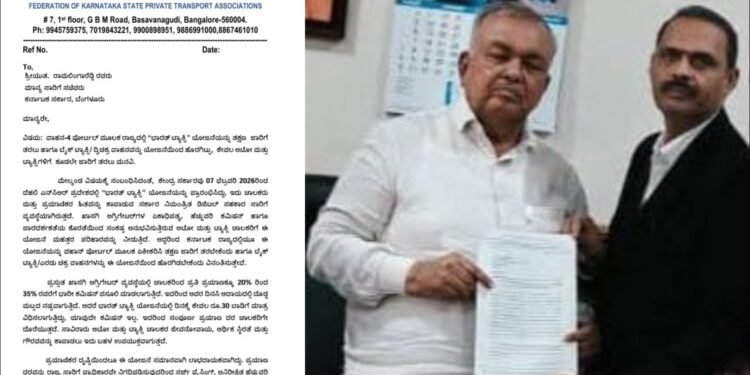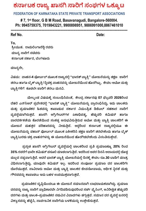 ಬೆಂಗಳೂರು | ಕೇಂದ್ರ ಸರ್ಕಾರದ ಭಾರತ್ ಟ್ಯಾಕ್ಸಿ ಯೋಜನೆಯನ್ನು ಕರ್ನಾಟಕದಲ್ಲಿ ಜಾರಿಗೆ ತರಬೇಕು ಎಂದು ರಾಜ್ಯ ಖಾಸಗಿ ಸಾರಿಗೆ ಸಂಘಗಳ ಒಕ್ಕೂಟವು ಒತ್ತಾಯಿಸಿದ್ದು, ಈ ಸಂಬಂಧ ರಾಜ್ಯ ಸಾರಿಗೆ ಸಚಿವ ರಾಮಲಿಂಗಾರೆಡ್ಡಿ ಅವರಿಗೆ ಮನವಿ ಸಲ್ಲಿಸಲಾಗಿದೆ.