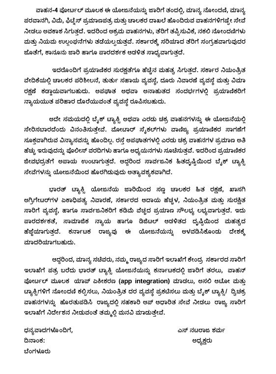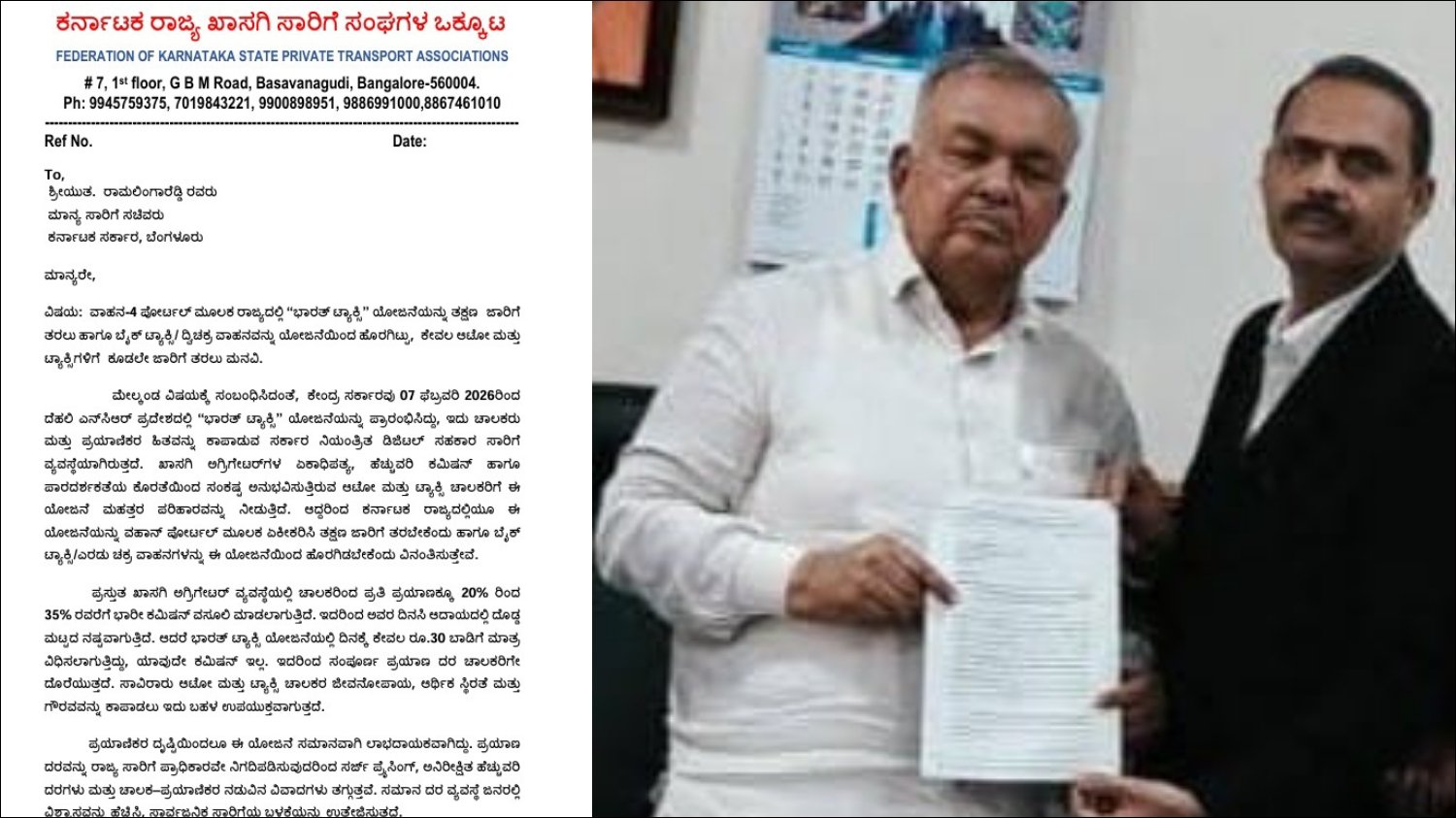 ಸಚಿವರು ಒಕ್ಕೂಟದ ಮನವಿಯನ್ನು ಸ್ವೀಕರಿಸಿ, ವಿಚಾರಣೆಯ ನಂತರ ಕೇಂದ್ರಕ್ಕೆ ಪತ್ರ ಬರೆಯುವುದಾಗಿ ಭರವಸೆ ನೀಡಿದ್ದಾರೆ. ಇದರೊಂದಿಗೆ, ರಾಜ್ಯದ ಖಾಸಗಿ ಟ್ಯಾಕ್ಸಿ ಚಾಲಕರು ಹೆಚ್ಚು ಲಾಭ, ಸುರಕ್ಷತೆ ಮತ್ತು ನಿರಂತರ ಆದಾಯವನ್ನು ಪಡೆಯುವ ಅವಕಾಶ ಹೊಂದಿದ್ದಾರೆ. ಭಾರತ್ ಟ್ಯಾಕ್ಸಿ ಯೋಜನೆ ಜಾರಿಗೆ ಬಂದರೆ, ಇದು ಕರ್ನಾಟಕದಲ್ಲಿ ಖಾಸಗಿ ಟ್ಯಾಕ್ಸಿ ಸೇವೆಯನ್ನು ಹೆಚ್ಚು ಪಾರದರ್ಶಕ, ವಿಶ್ವಾಸಾರ್ಹ ಮತ್ತು ಪ್ರಯಾಣಿಕರಿಗೂ ಅನುಕೂಲಕರವಾಗಿಸಲಿದೆ ಎಂದು ನಿರೀಕ್ಷೆ ಮಾಡಲಾಗುತ್ತಿದೆ. ಮುಂದೇನಾಗುತ್ತೆ ಎಂದು ಕಾದುನೋಡಬೇಕಿದೆ.