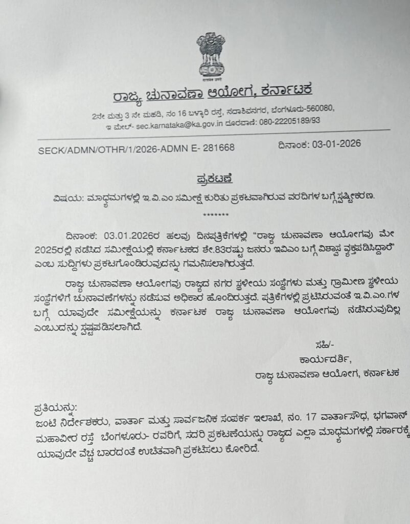 ಈ ಕುರಿತು ಮಾಧ್ಯಮ ಪ್ರಕಟಣೆ ನೀಡಿರುವ ಅವರು, ಕಳೆದ ಜನವರಿ 3ರಂದು ಕೆಲವು ದಿನಪತ್ರಿಕೆಗಳಲ್ಲಿ ರಾಜ್ಯ ಚುನಾವಣಾ ಆಯೋಗವು ಮೇ 2025ರಲ್ಲಿ ನಡೆಸಿದ ಸಮೀಕ್ಷೆಯಲ್ಲಿ ಕರ್ನಾಟಕದ ಶೇ.83ರಷ್ಟು ಜನರು ವಿಶ್ವಾಸ ವ್ಯಕ್ತಪಡಿಸಿದ್ದಾರೆ ಎಂಬ ಸುದ್ದಿಗಳನ್ನು ಪ್ರಕಟಿಸಿರುವುದನ್ನು ಆಯೋಗ ಗಮನಿಸಿದೆ.