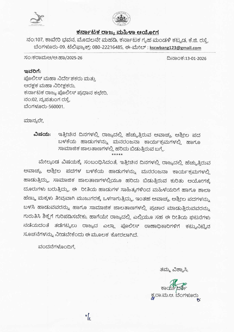 ಬೆಂಗಳೂರು : ಇತ್ತೀಚಿನ ದಿನಗಳಲ್ಲಿ ರಾಜ್ಯದಲ್ಲಿ ಅವಾಚ್ಯ ಮತ್ತು ಅಶ್ಲೀಲ ಪದ ಬಳಕೆಯ ಹಾಡುಗಳನ್ನು ಮನರಂಜನಾ ಕಾರ್ಯಕ್ರಮಗಳಲ್ಲಿ ಹಾಗೂ ಸಾಮಾಜಿಕ ಜಾಲತಾಣಗಳಲ್ಲಿ ಹರಿ ಬಿಡುತ್ತಿರುವವರ ಸಂಖ್ಯೆ ಹೆಚ್ಚಾಗುತ್ತಿದ್ದು, ಇಂಥಹವರ ವಿರುದ್ಧ ಕಟ್ಟುನಿಟ್ಟಿನ ಕ್ರಮ ಕೈಗೊಳ್ಳಬೇಕೆಂದು ರಾಜ್ಯ ಮಹಿಳಾ ಆಯೋಗವು ಕರ್ನಾಟಕ ಪೊಲೀಸ್ ಇಲಾಖೆಗೆ ಪತ್ರದ ಮೂಲಕ ಮನವಿ ಮಾಡಿದೆ.