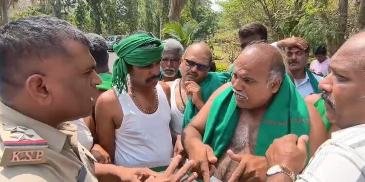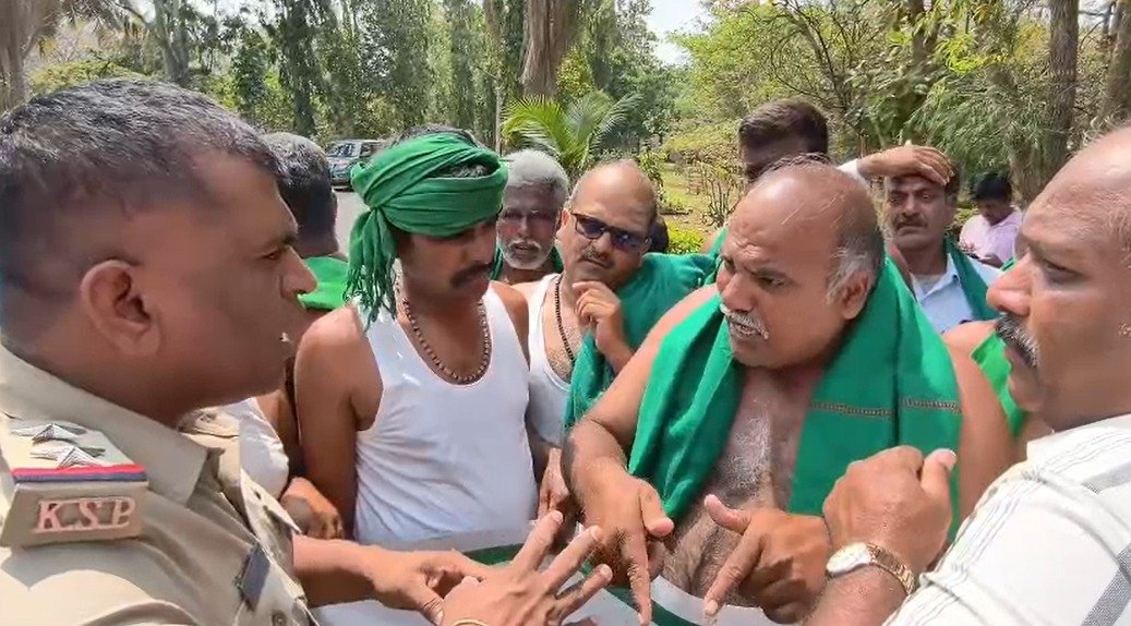 ಆರ್.ಸಿ ಕಚೇರಿಗೆ ಪ್ರವೇಶಿಸಲು ಯತ್ನಿಸಿದ ರೈತರನ್ನು ಪೊಲೀಸರು ತಡೆದಿದ್ದಾರೆ.