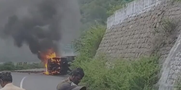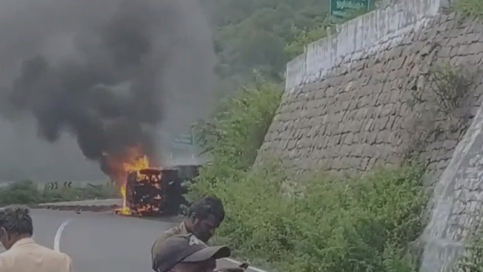 ಕಬ್ಬಿಣ ತುಂಬಿಕೊಂಡು ಹೋಗುತ್ತಿದ್ದ ಪಿಕಪ್ ವಾಹನ ದಿಂಬಂ ಘಾಟ್ ನ ಆರನೇ ತಿರುವಿನಲ್ಲಿ ಪಲ್ಟಿಯಾಗಿ ಬಳಿಕ ಹೊತ್ತಿ ಉರಿದೆ.