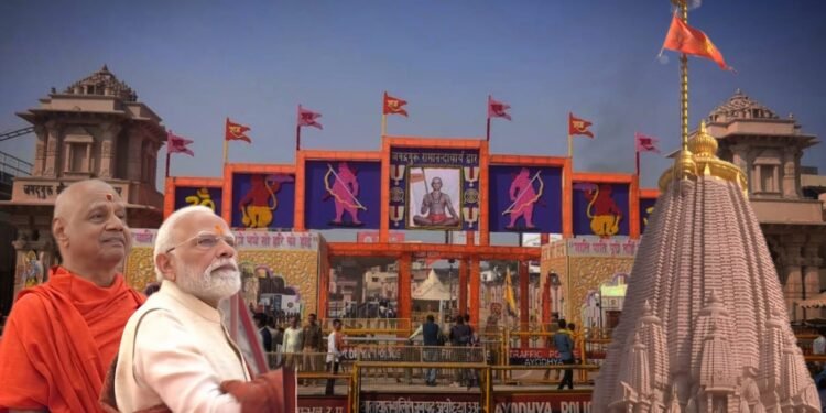 ಅಯೋಧ್ಯೆ: ಪ್ರಧಾನಿ ನರೇಂದ್ರ ಮೋದಿ ಅವರು ಮಂಗಳವಾರ ಅಯೋಧ್ಯೆಯ ಭವ್ಯ ರಾಮಮಂದಿರದ ಶಿಖರದ ಮೇಲೆ ಕೇಸರಿ ಧ್ವಜವನ್ನು ಹಾರಿಸುವ ಮೂಲಕ ಐತಿಹಾಸಿಕ ಮಂದಿರದ ನಿರ್ಮಾಣ ಕಾರ್ಯ ಪೂರ್ಣಗೊಂಡಿರುವುದನ್ನು ಸಾಂಕೇತಿಕವಾಗಿ ಘೋಷಿಸಿದ್ದಾರೆ. ಈ ಧ್ವಜಾರೋಹಣ ಸಮಾರಂಭದೊಂದಿಗೆ ಕೋಟ್ಯಂತರ ಭಾರತೀಯರ ಕನಸಾದ ರಾಮಮಂದಿರ ನಿರ್ಮಾಣದ ಅಂತಿಮ ಹಂತ ಪೂರ್ಣಗೊಂಡಂತಾಗಿದೆ.