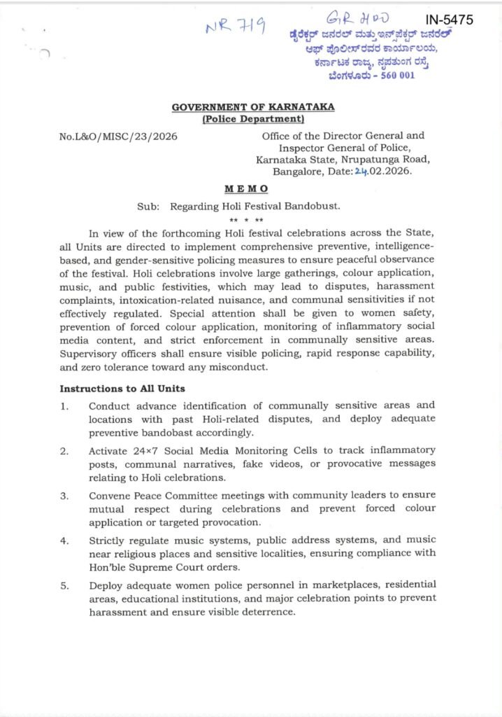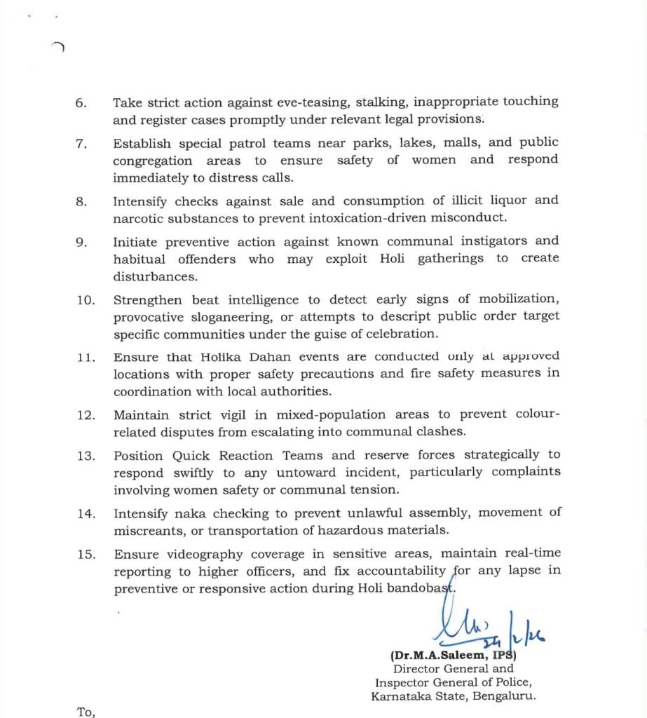 ಬೆಂಗಳೂರು: ಹೋಳಿ ಹಬ್ಬದ ಆಚರಣೆ ಹಿನ್ನೆಲೆಯಲ್ಲಿ ರಾಜ್ಯ ಪೊಲೀಸ್ ಇಲಾಖೆ ವ್ಯಾಪಕ ಸಿದ್ಧತೆ ನಡೆಸಿದ್ದು, 15 ಅಂಶಗಳ ವಿಶೇಷ ಆದೇಶವನ್ನು ಬಿಡುಗಡೆ ಮಾಡಿದೆ. ಸಾರ್ವಜನಿಕ ಶಾಂತಿ, ಕಾನೂನು ಸುವ್ಯವಸ್ಥೆ ಹಾಗೂ ಸೌಹಾರ್ದತೆ ಕಾಪಾಡುವ ಉದ್ದೇಶದಿಂದ ಜಿಲ್ಲೆಗಳಿಗೆ ಕಟ್ಟುನಿಟ್ಟಿನ ಸೂಚನೆ ನೀಡಲಾಗಿದೆ.